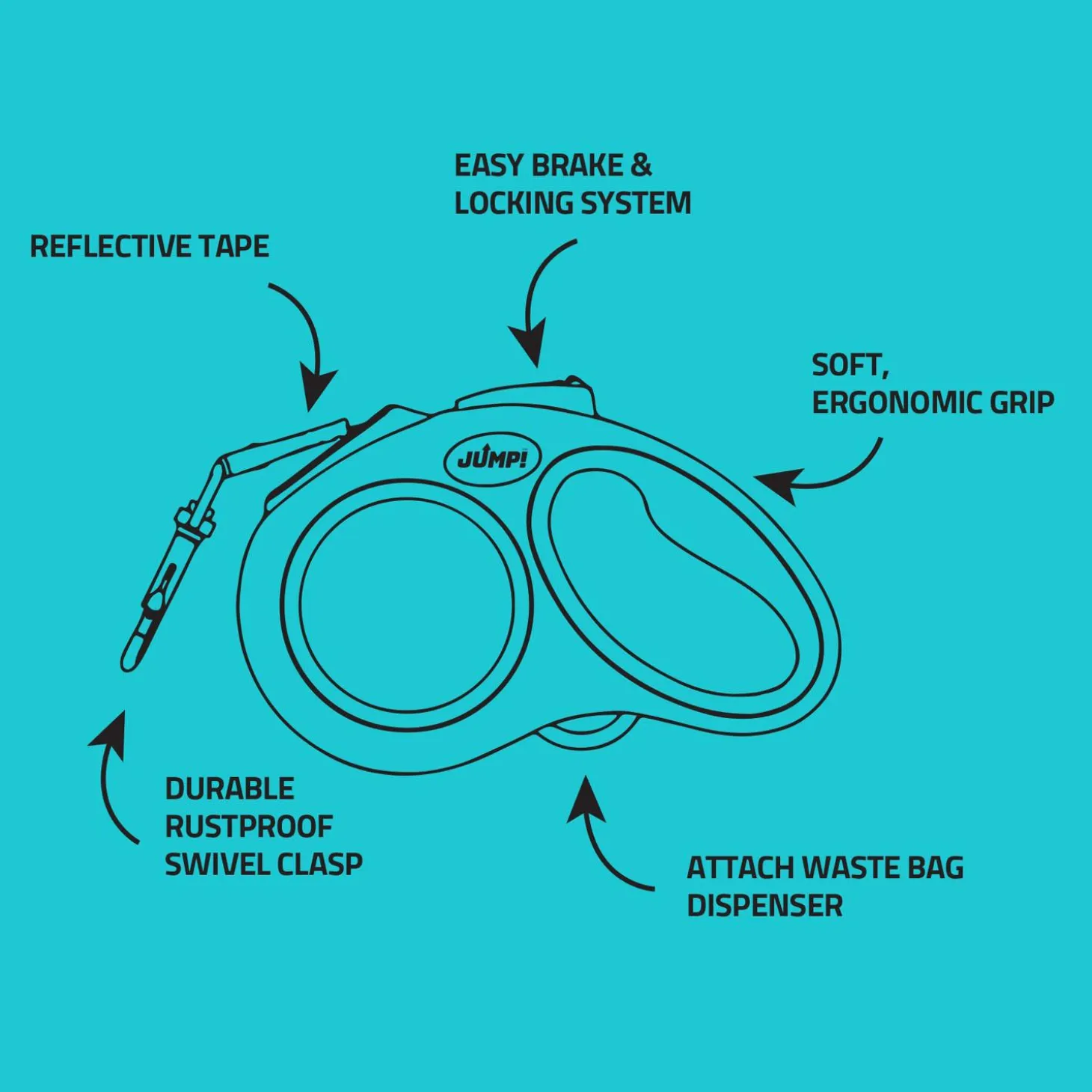 JUMP! Soft Grip Ribbon Tape 16ft Retractable Black Dog Leash was created with your furry companion in mind! This high-quality leash lets your pet explore and sniff while giving you peace of mind. The leash is tested for its mechanism and durability, ensuring performance in Canadian weather! The new 4.9m (16 ft) tape model has a soft grip, modern ergonomic design, a comfortable braking system, reflective stitching for low-light visibility and a perfected guidance system.