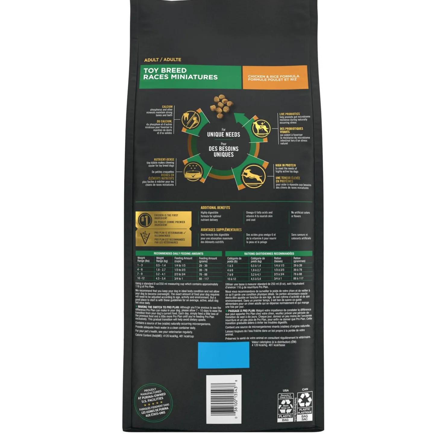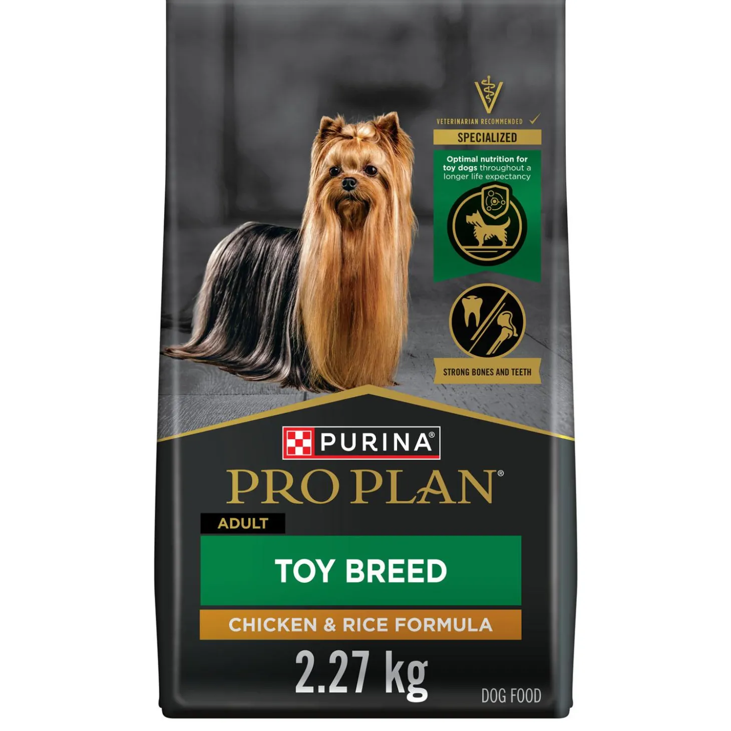 Purina Pro Plan Specialized Toy Breed Chicken & Rice Formula Adult Dog Food is made with chicken as the first ingredient. High in protein to meet the needs of highly active toy breed dogs. It is made with calcium, phosphorus and other minerals to maintain strong bones and teeth.
