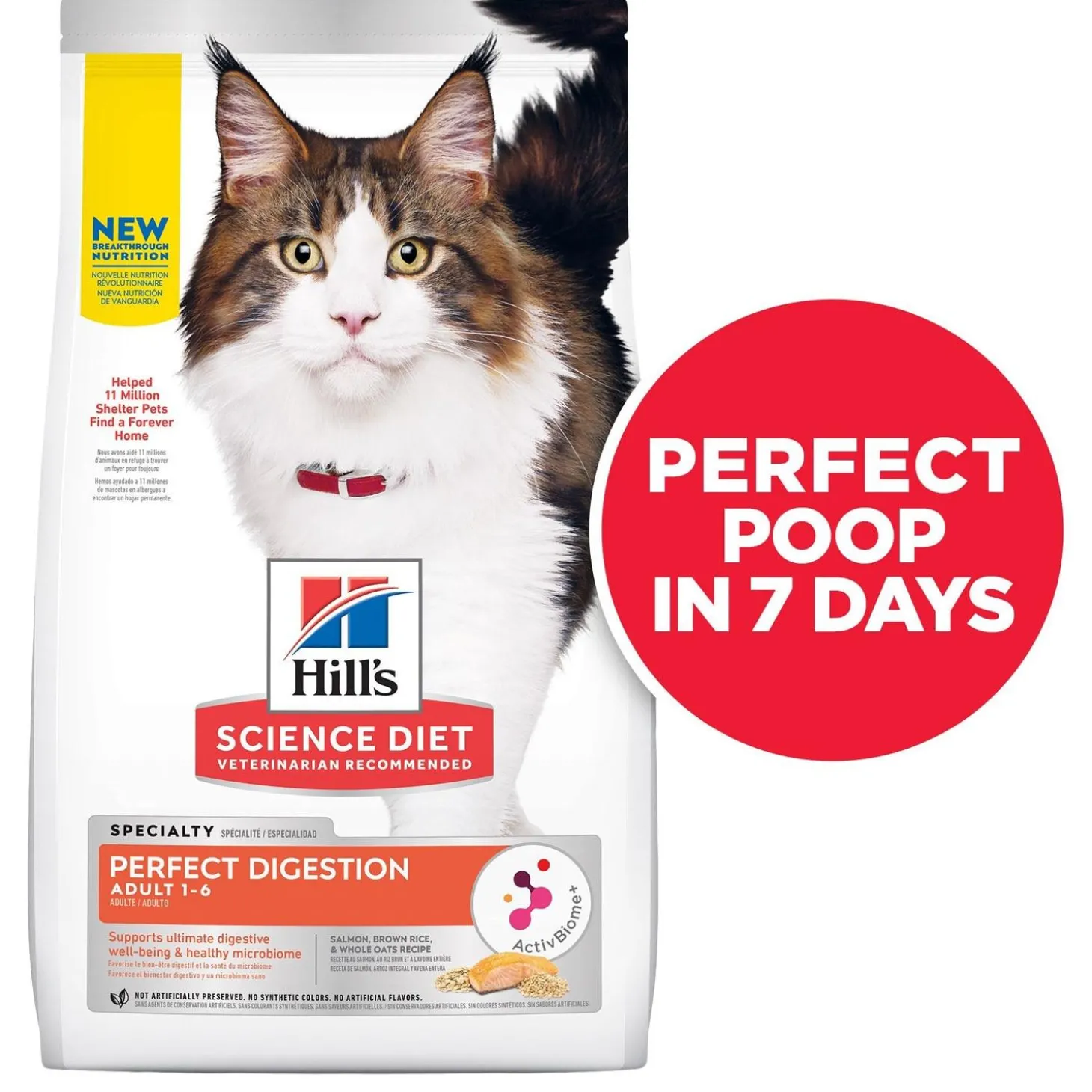 Hill’s Science Diet Specialty Perfect Digestion Salmon, Brown Rice & Whole Oats Recipe Adult Cat Food is a breakthrough nutrition that supports each cat’s unique gut microbiome for healthy digestion and balanced nutrition that helps your cat feel their best. Every cat has an entire ecosystem living within them – the gut microbiome, full of billions of diverse microbes unique to your pet. With the right nutrients to help balance their microbiome, you can actually affect not only their digestive health, but their overall well-being.