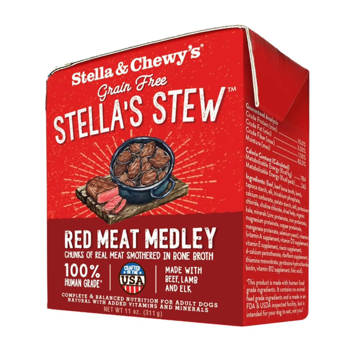 Stella & Chewy’s Stella’s Stew Red Meat Medley Dog Food is made with real whole muscle meat and organic fresh-cut vegetables. They are gently kettle-cooked in small batches to deliver great taste and amazing nutrition.