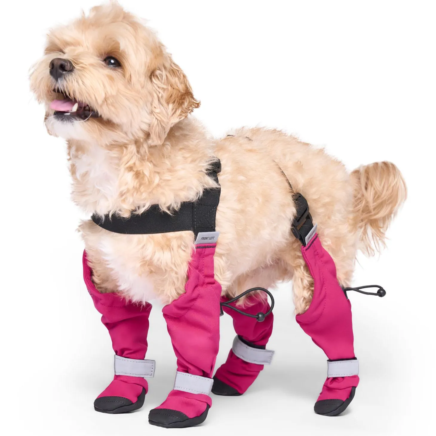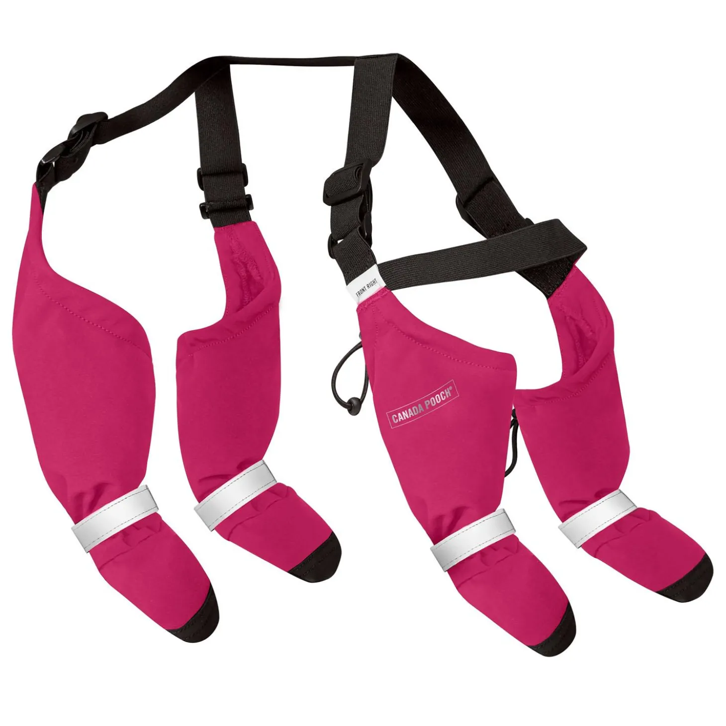 Canada Pooch Suspender Short Pink Dog Boots provide secure paw protection and extended leg coverage. They’re adjustable and connected dog boots, which means you’ll never lose a boot. They’re also easy to layer with your favorite outerwear to stay clean and dry. (4 dog boots connected to each other)