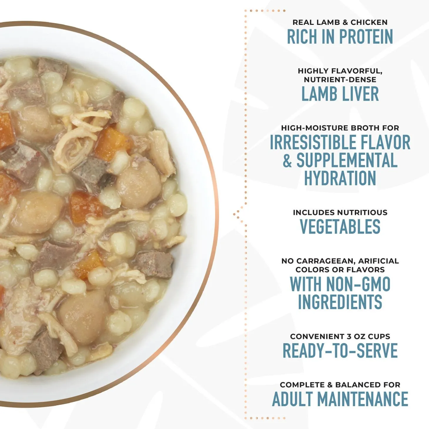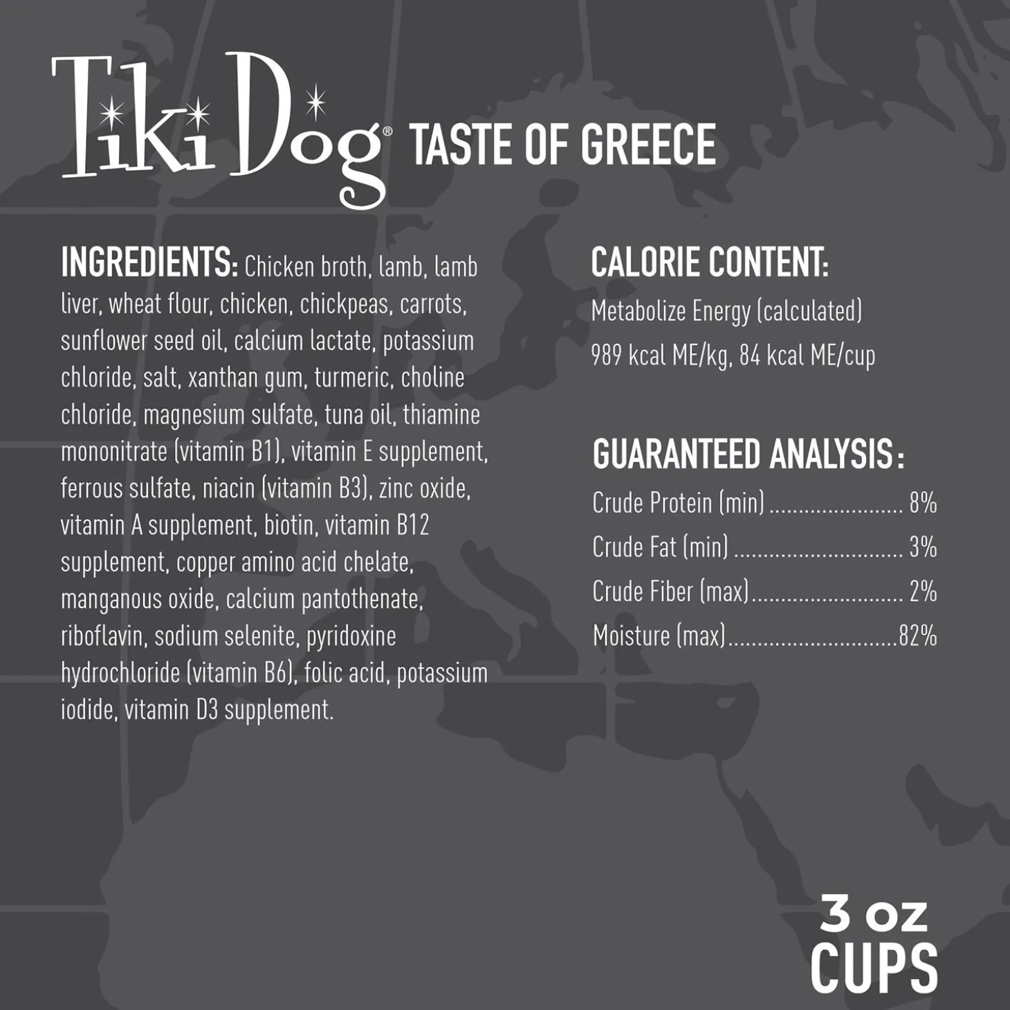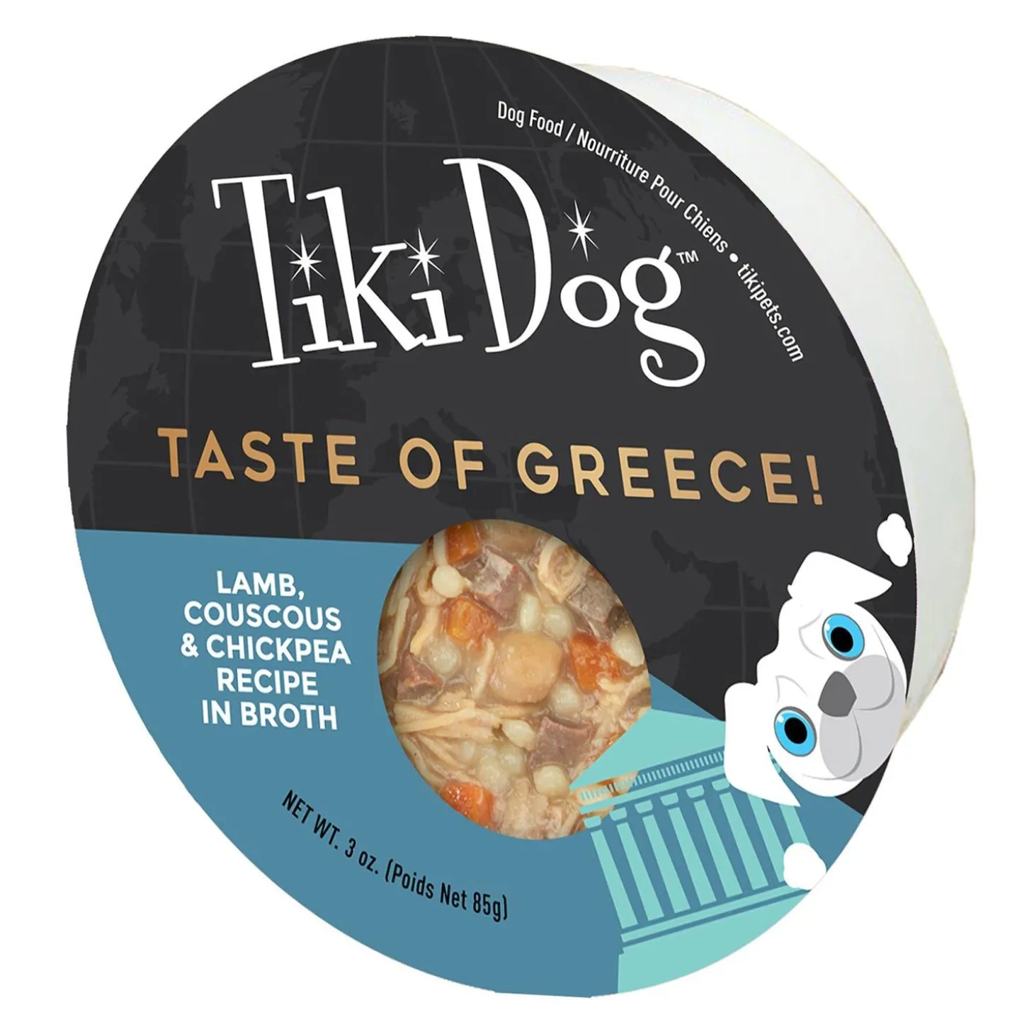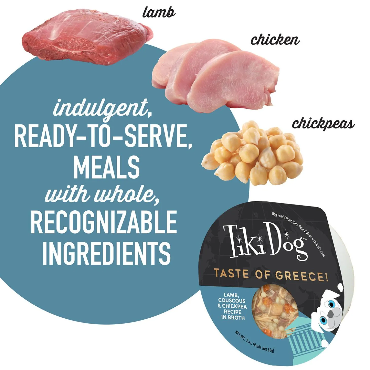 Tiki Dog Taste of the World Greece Lamb, Couscous & Chickpea Recipe in Broth Adult Dog Food will indulge your dog with a taste of international cuisine. These restaurant-inspired meals feature whole, recognizable ingredients. Tiki Dog offers drool-worthy taste in the nutrition that dogs need! Designed with the highest standards in nutrition to keep dogs in optimal health, and you can see it in every bowl.