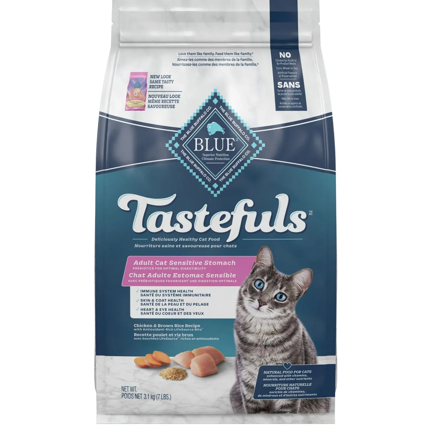 Blue Buffalo Tastefuls Sensitive Stomach Chicken & Brown Rice Recipe Adult Cat Food is made with the finest natural ingredients enhanced with vitamins and minerals. Starting with real meat as the 1st ingredient, it includes wholesome grains, veggies and fruit, plus our exclusive, antioxidant-rich LifeSource Bits to support your feline’s overall health and well-being. Tastefuls has formulations to meet all of your cat’s life stage and lifestyle needs, from hairball and weight control to sensitive stomach and healthy aging recipes. Tastefuls is a product of the Blue Buffalo company. Based in the United States, Blue Buffalo makes premium-quality pet foods.