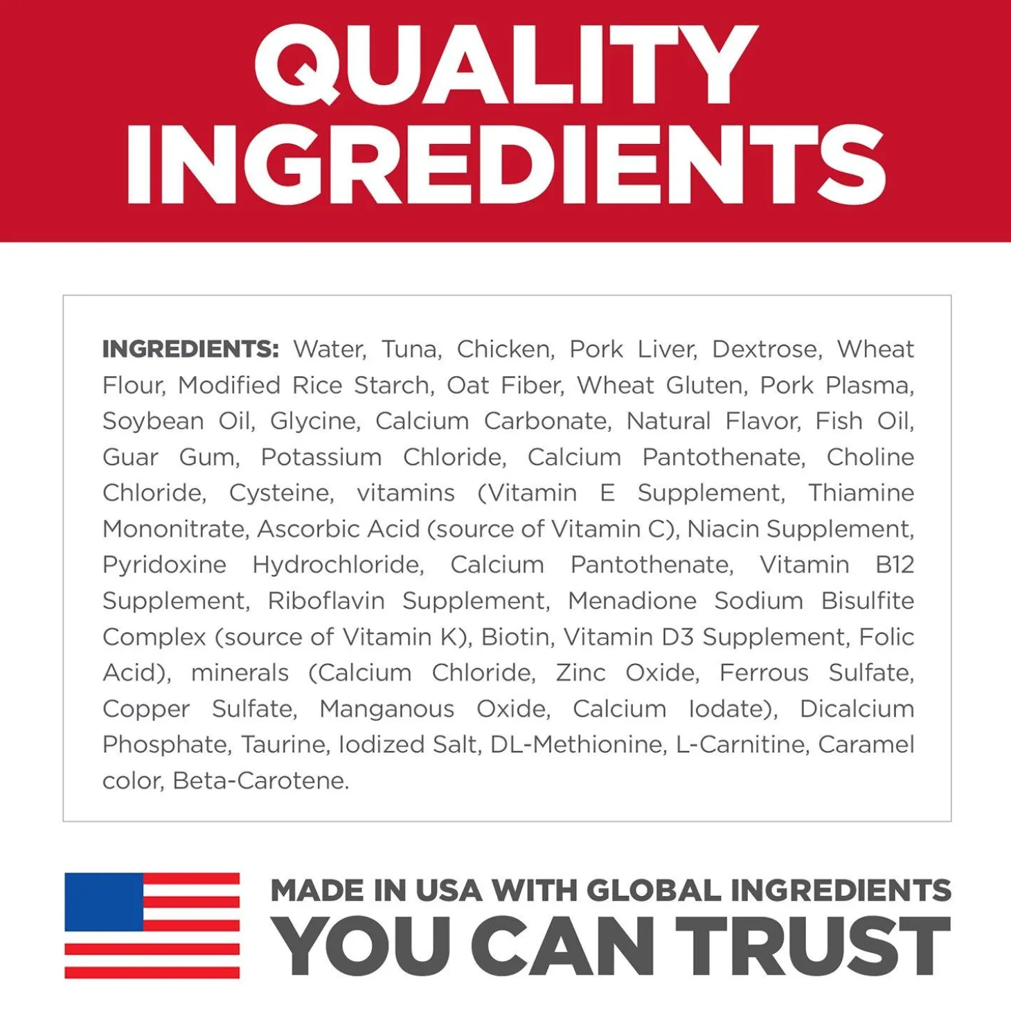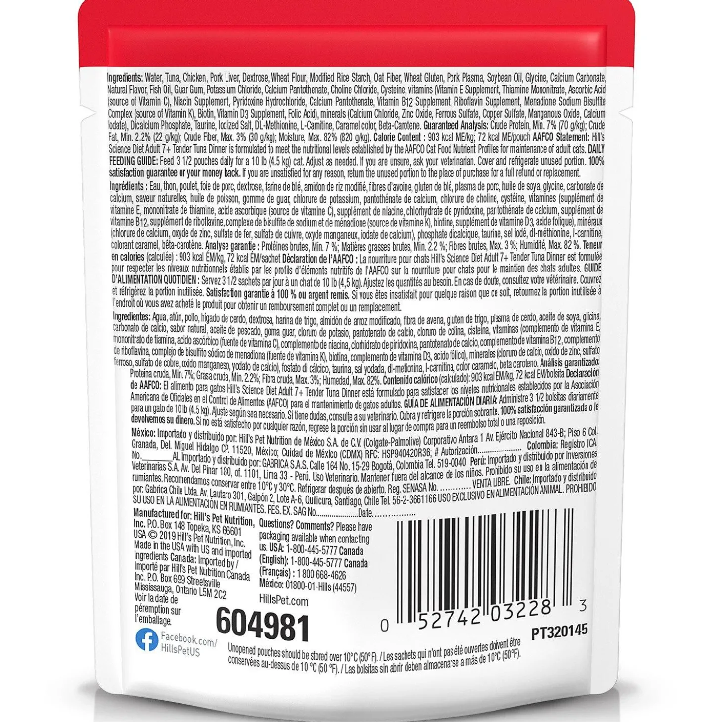 Hill’s Science Diet Tender Tuna Dinner in Gravy Adult 7+ Cat Food comes in a pouch that’s easy to open and easy to feed. With delicious chunks in a decadent gravy, even the most picky eaters will love this soft and tender cat food. Made in the USA with global ingredients you can trust, it includes clinically proven antioxidants to support a healthy immune system for cats age 7+. Cater to your senior cat’s refined palate with a taste more sophisticated than kitten food, and serve this gourmet daily nutrition as a balanced meal by itself or try it on top of Hills Science Diet Adult dry kibble.