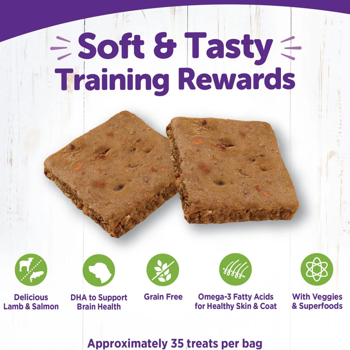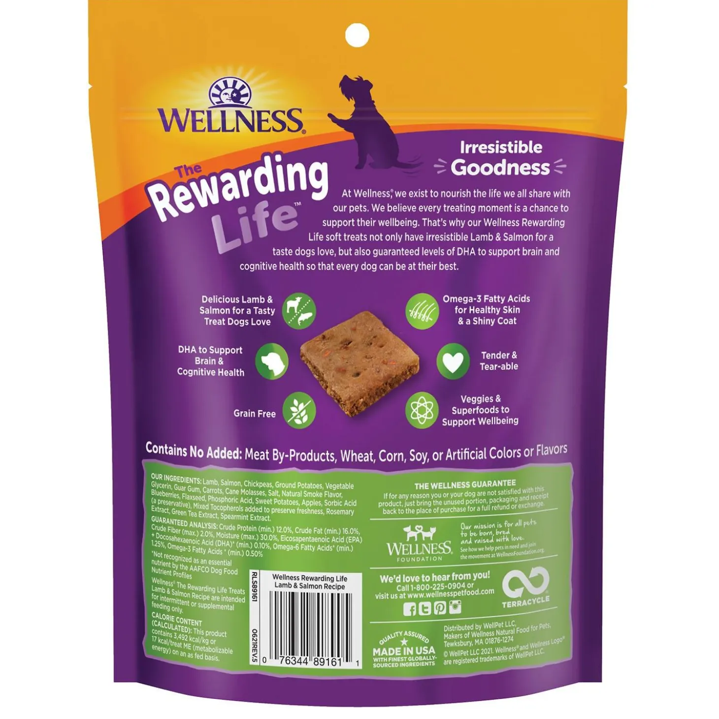 Wellness The Rewarding Life Lamb & Salmon Recipe Dog Treats are wholesome, healthy, soft, tasty, bite-sized dog treats made in USA only. These soft dog treats are made with simple, healthy, high quality ingredients and contain no corn, soy, artificial colours or flavours.