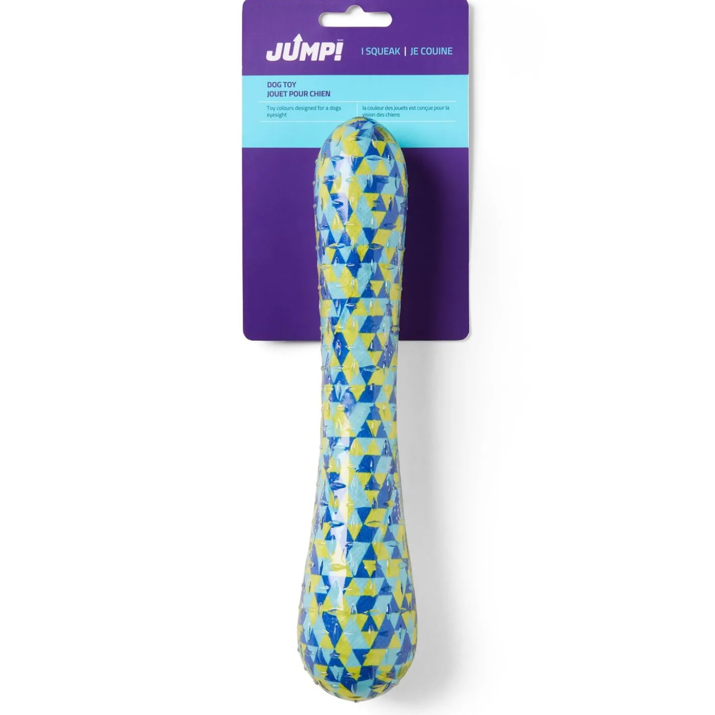 JUMP! TPR Printed Stick Dog Toy is squeaky good time. Durable, this rubber toy is ready for heavy chews and can even float! Plus, the blue and yellow colour scheme is highly visible to your pups eyes.