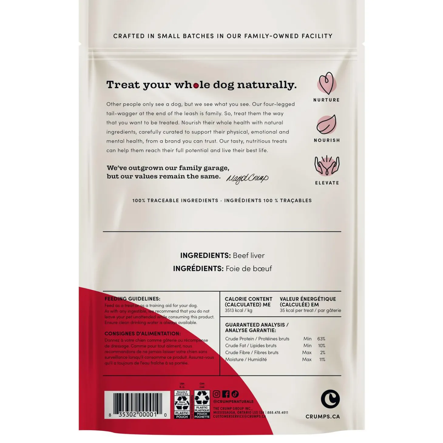 Crumps’ Naturals Traditional Liver Fillets Dog Treats are made from high quality North American beef liver. These delicious single-ingredient treats are baked low and slow gently dehydrating them to lock in nutrients and flavour. The liver fillets large size makes them perfect for large breeds and working dogs, while their ability to break apart easily makes them great for feeding any breed regardless of age or size. High in protein and essential nutrients, these treats support muscle development and overall health, making Crumps’ Naturals Traditional Liver Fillets an excellent choice for rewarding your pet.