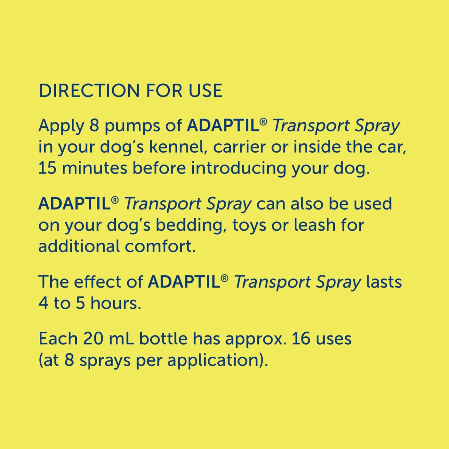 Use: Apply 8 pumps of ADAPTIL Transport Spray in your dog’s kennel, carrier, or inside the car, 15 minutes before introducing your dog. ADAPTIL Transport Spray can also be used on your dog’s bedding, toys, or leash for additional comfort. The effect of ADAPTIL Transport Spray lasts 4 to 5 hours. Each 20ml bottle has approx. 16 uses (at 8 sprays per application).