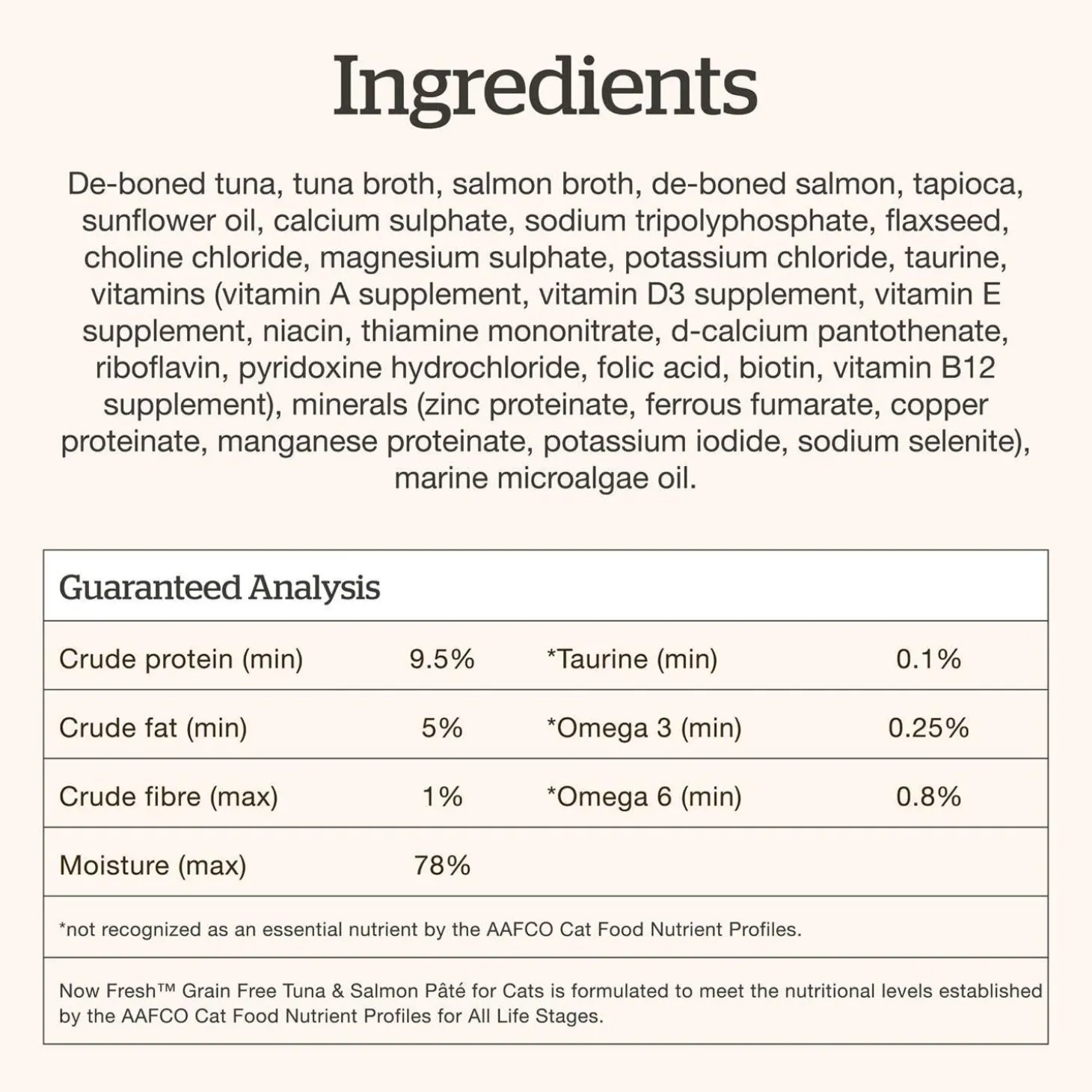 Now Fresh Tuna & Salmon Pate Grain-Free Cat Food is designed to elevate mealtime and provide essential nutrients. Featuring a blend of premium ingredients including fresh de-boned tuna and salmon, fibre-rich flaxseed for digestive support, and marine microalgae oil and sunflower oil as sources of omega-3 and 6 fatty acids. This delicious chicken-free pate indulges your feline friend by offering a soft texture that they love, and is crafted to cater to your cat’s nutritional needs and support healthy hydration.