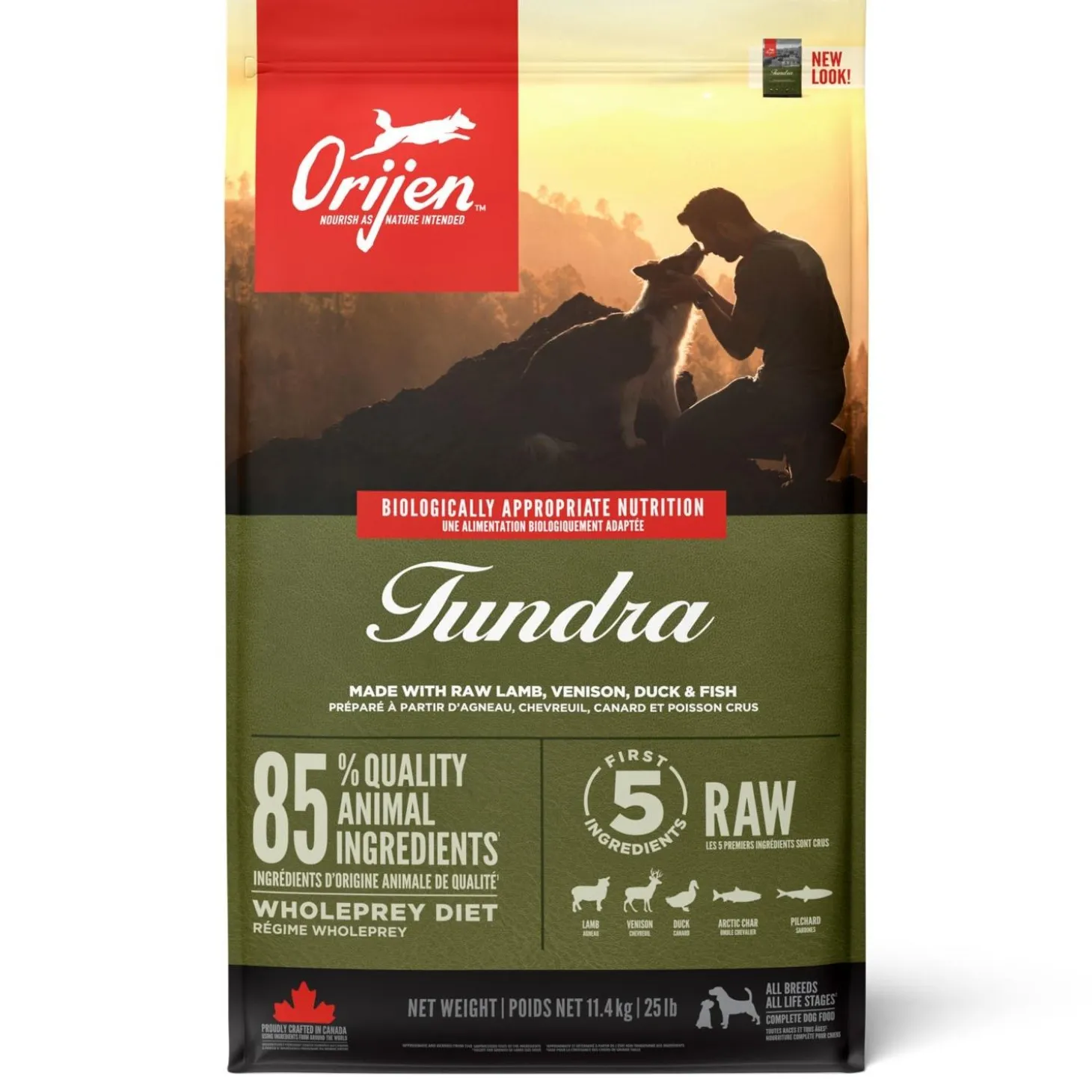 ORIJEN Tundra Raw Lamb, Venison, Duck & Fish Dog Food is perfect for your companion because all modern-day dogs have evolved from the grey wolf, biologically requiring a diet that is rich and varied in whole game, fish, and fowl. ORIJEN Tundra provides your dog with the nourishing protein and nutrients they need, from fresh goat, wild boar, ranch-raised venison, Arctic char, free-run duck, and mutton. Two-thirds of the animal ingredients are FRESH or RAW, for a concentrated source of protein. In Whole Prey ratios of meat, organs, cartilage, and bone, Tundra has everything your dog needs for peak health, with a unique and delicious taste that they’ll love.