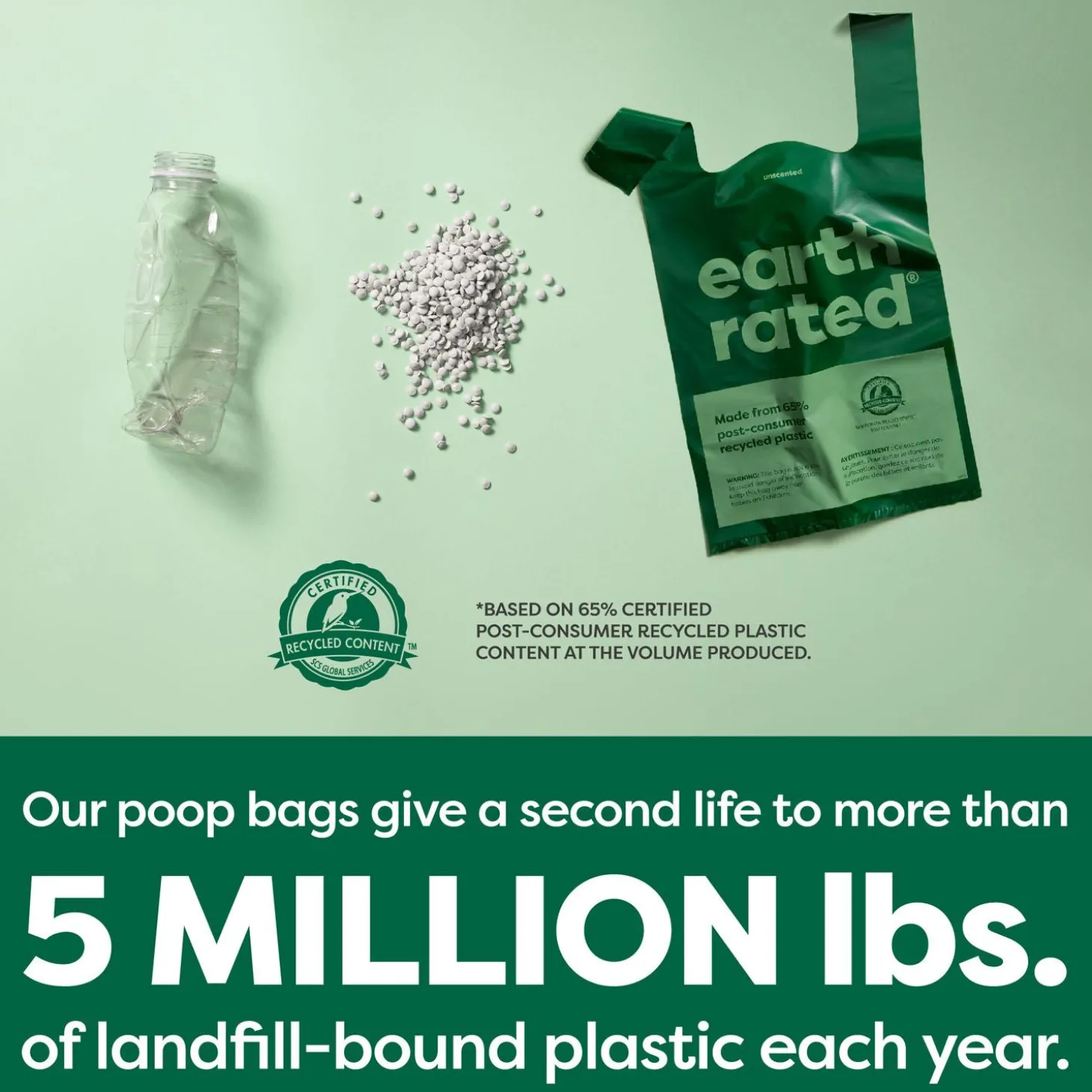 - A BETTER POOP BAG: Earth Rated make their dog poop bags with 65% certified post-consumer recycled plastic, giving a second life to over 5 million pounds/2.2 million kg of landfill-bound plastic a year.