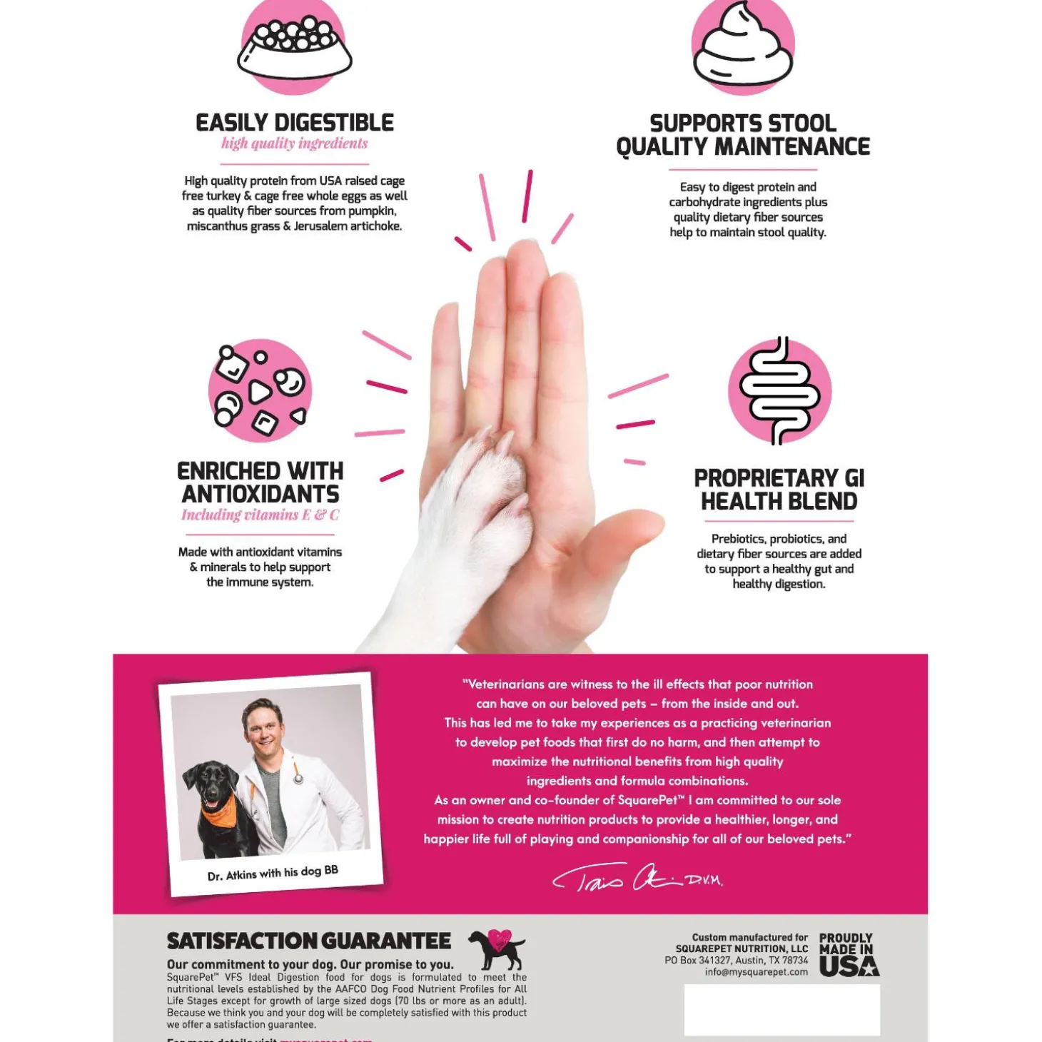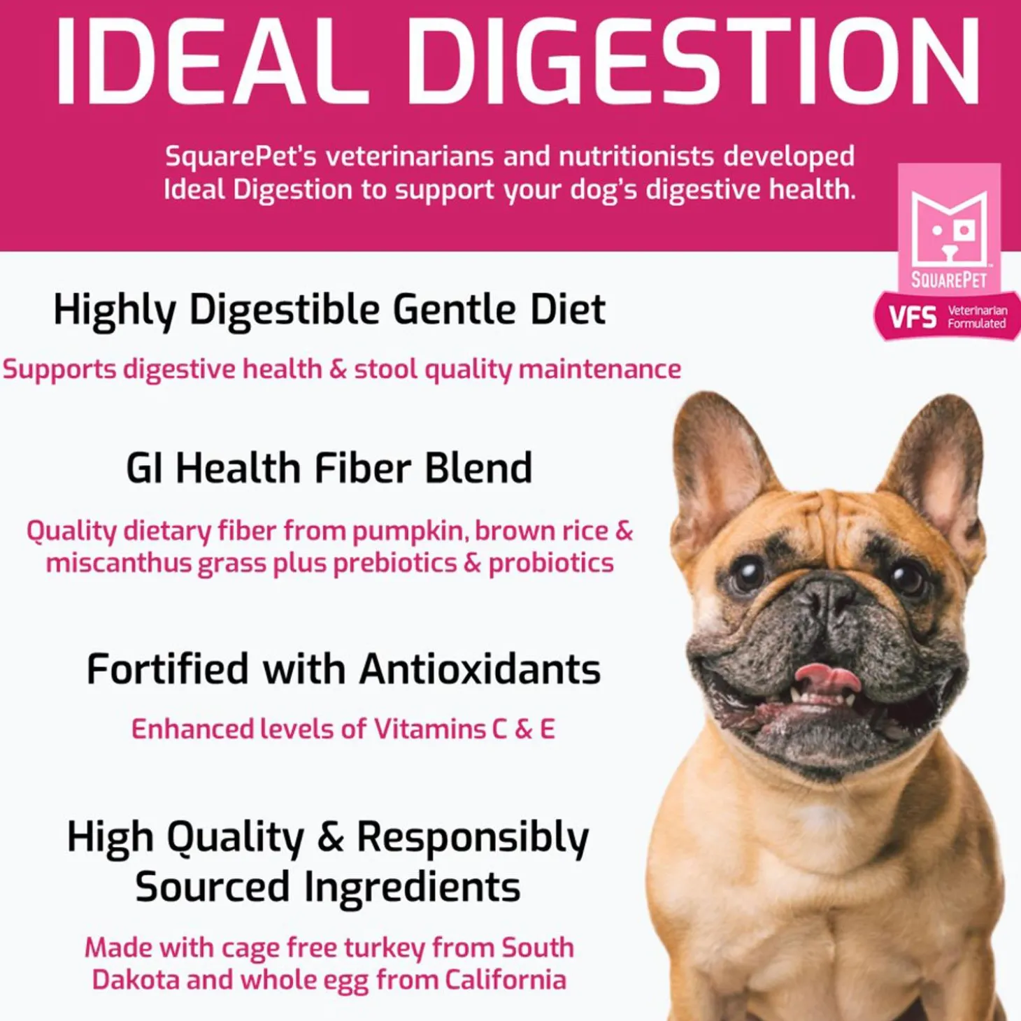 SquarePet VFS Ideal Digestion Dog Food is a gentle and easy to digest diet that has been developed by SquarePet’s team of veterinary professionals to help support your dog’s digestive health. VFS Ideal Digestion is made with cage free turkey and eggs to create a highly palatable and easily digestible diet perfect for sensitive stomachs.