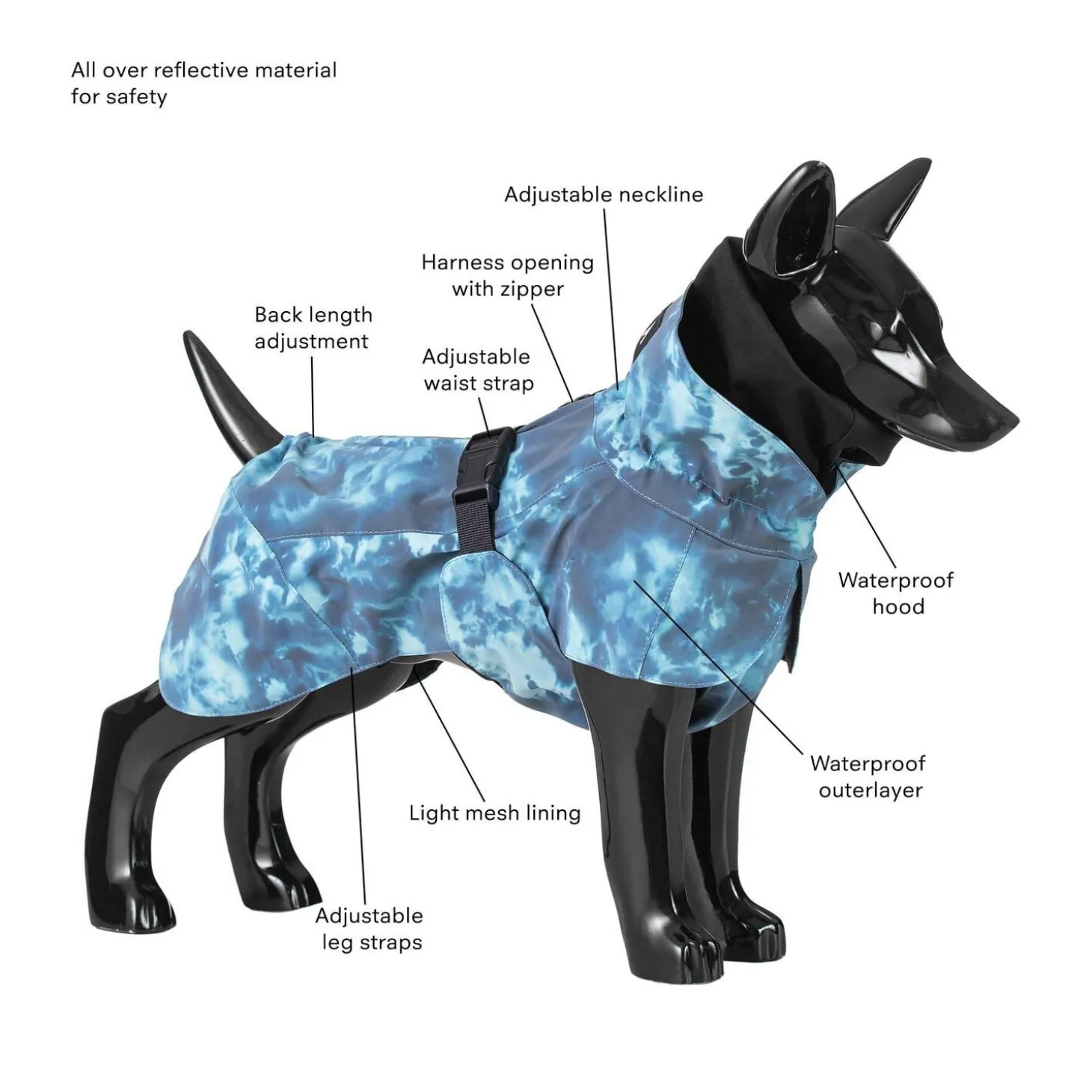 PAIKKA Visibility Lite Petrol Dye Raincoat with smart reflective surface ensures your dog is visible and stays safe when you head out for a walk. The jacket is made of 100% waterproof fabric and its seams are taped making sure your dog stays dry and comfortable while enjoying your urban outings or conquering trails in the wild woods. This raincoat is easy to rinse clean after a walk and thanks to convenient mesh lining, it dries quickly so you will be ready for your next adventure in no time!