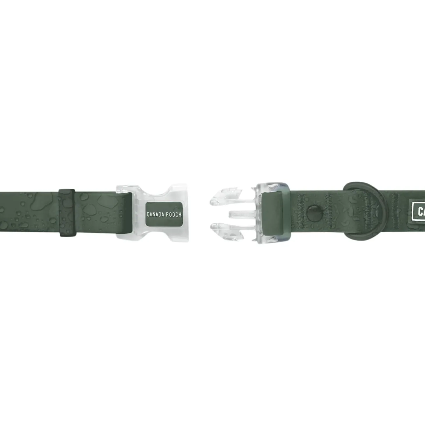 Canada Pooch Waterproof Forest Green Dog Collar is an odour-resistant and waterproof dog collar for any adventure. Can be used in rain or shine, on land or in water. Made with extra strength PVC coated wedding making it easy to clean!
