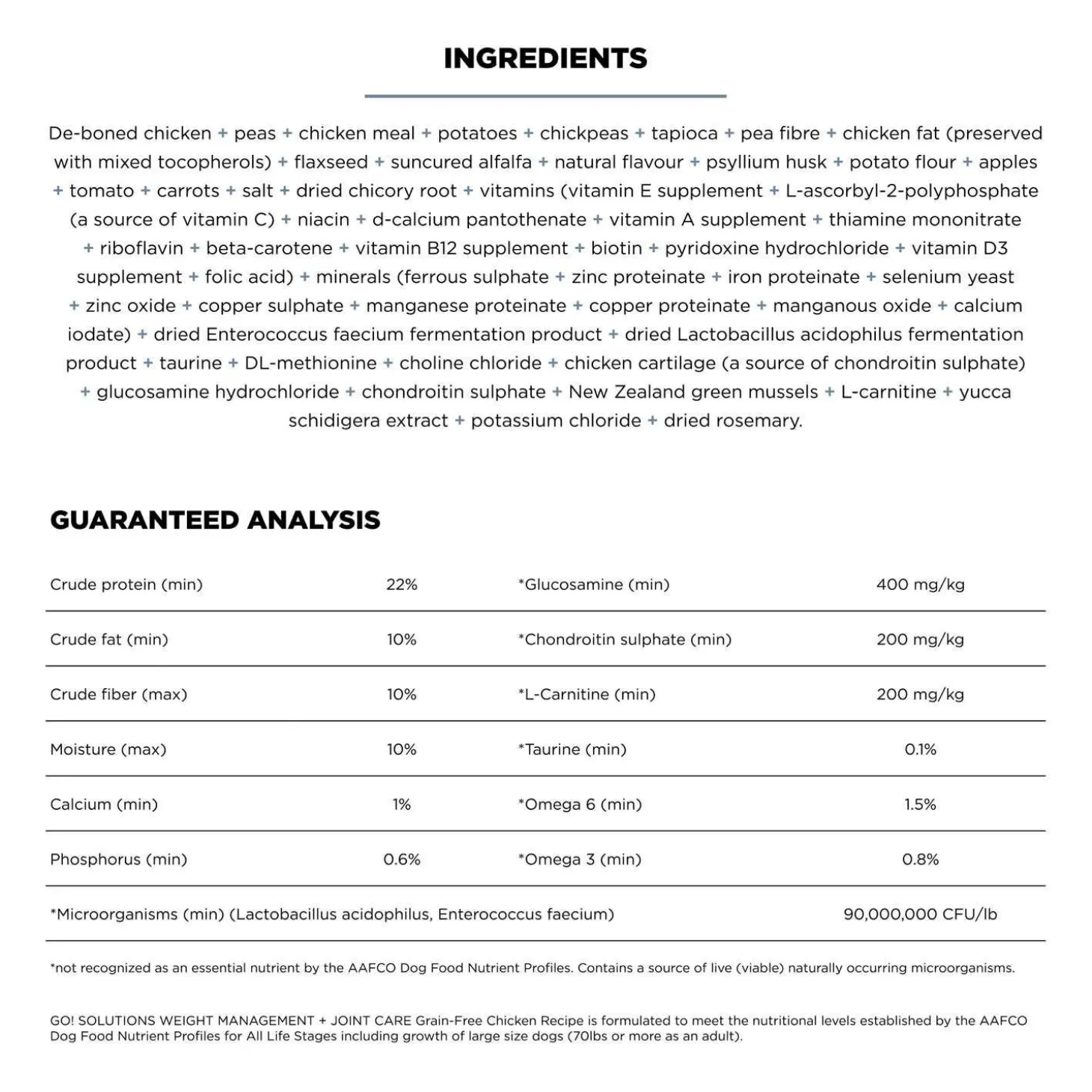 Go! Solutions Weight Management + Joint Care Grain Free Chicken Recipe Adult Dog Food is a great choice for your furry friend. This recipe is packed with lean protein, healthy fats, and ingredients that support a healthy weight and mobile joints, to help your furry friend feel great for years to come.