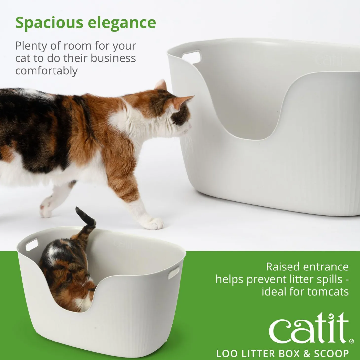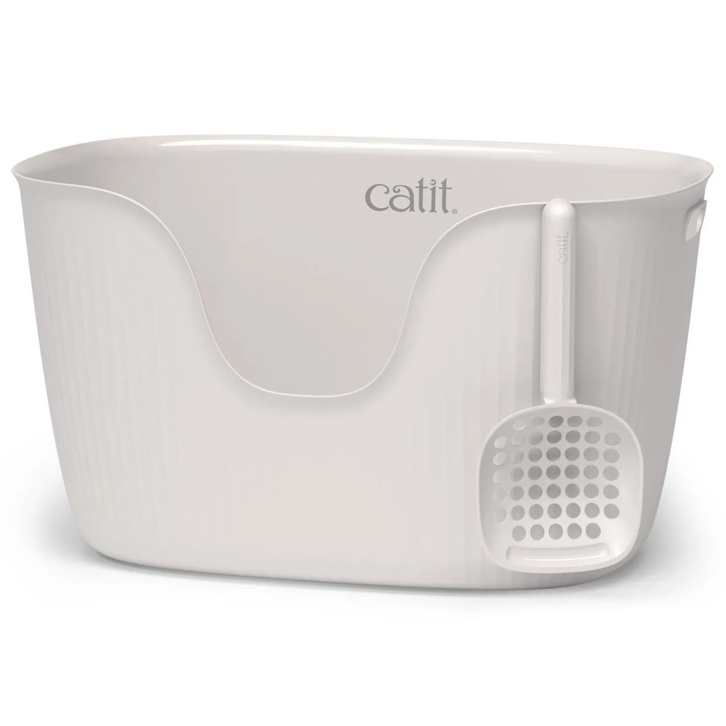 Catit White Loo Litter Box & Scoop is an easy entry cat litter box, that’s practical, open, with beautifully flowing, natural curves. Thanks to its simplicity, the Catit Loo offers cats enough room to dig, turn, and bury their business – all within a fairly compact footprint. It is made of 99% post-consumer recycled plastic, helping to minimize plastic waste and support the reuse of materials that would otherwise end up in landfills. In addition, the litter box is BPA-free. It includes a matching scoop you can hang from the top by the handle, designed so the scooper won’t touch the box. The narrow indentation within the scoop catches small particles that would otherwise fall back in through the openings.