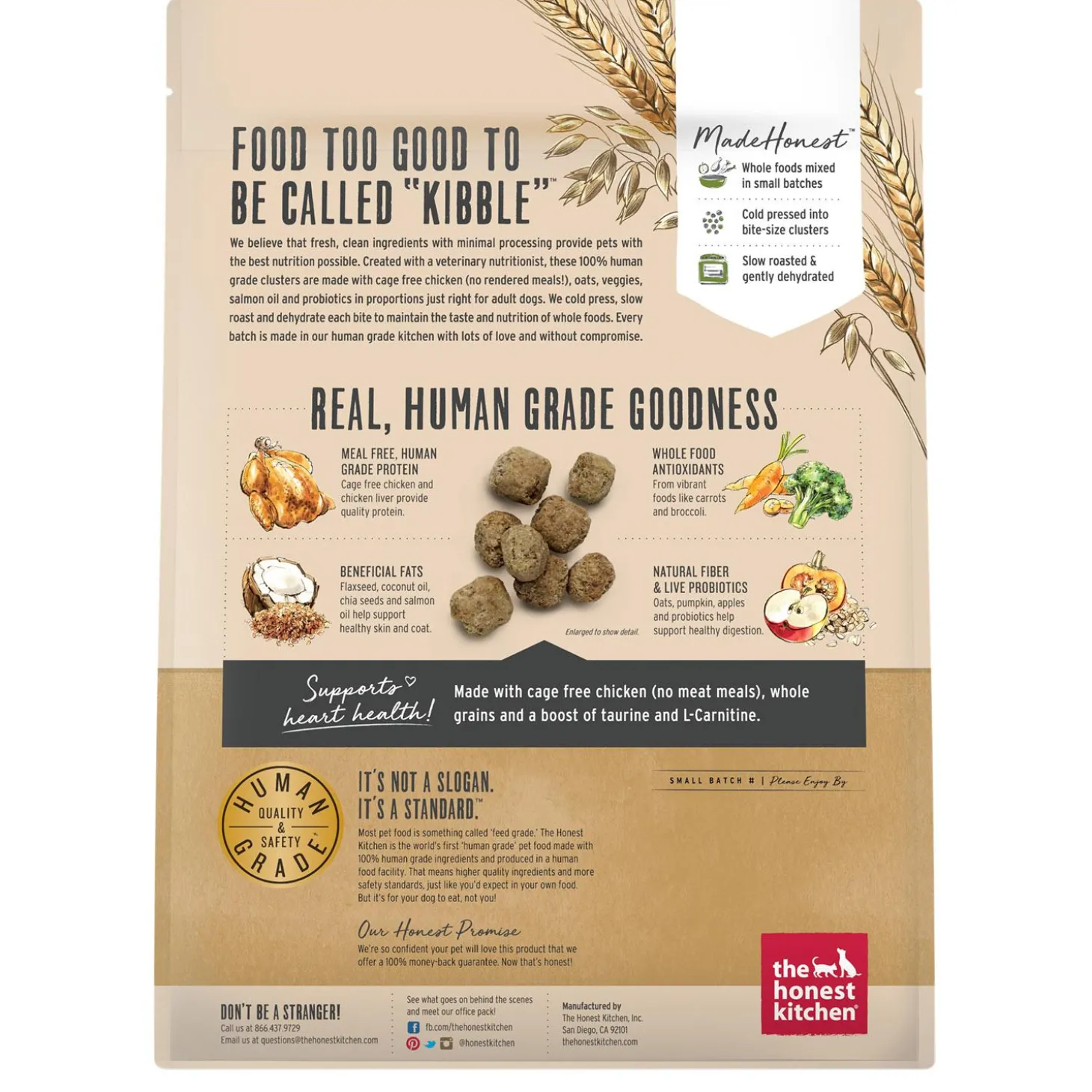 The Honest Kitchen Whole Grain Clusters Chicken & Oat Recipe Dog Food believes that fresh, clean ingredients with minimal processing provide pets with the best nutrition possible. Created with a veterinary nutritionist, these 100% human grade clusters are made with cage free chicken (no rendered meals!), oats, veggies, salmon oil and probiotics in proportions just right for adult dogs. It is then cold pressed, slow roasted and dehydrated to maintain the taste and nutrition of whole foods. Every batch is made in a human grade kitchen with lots of love and without compromise.