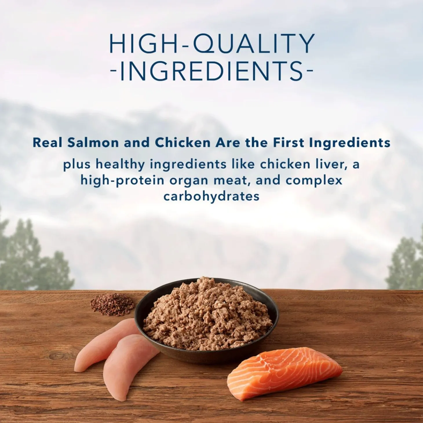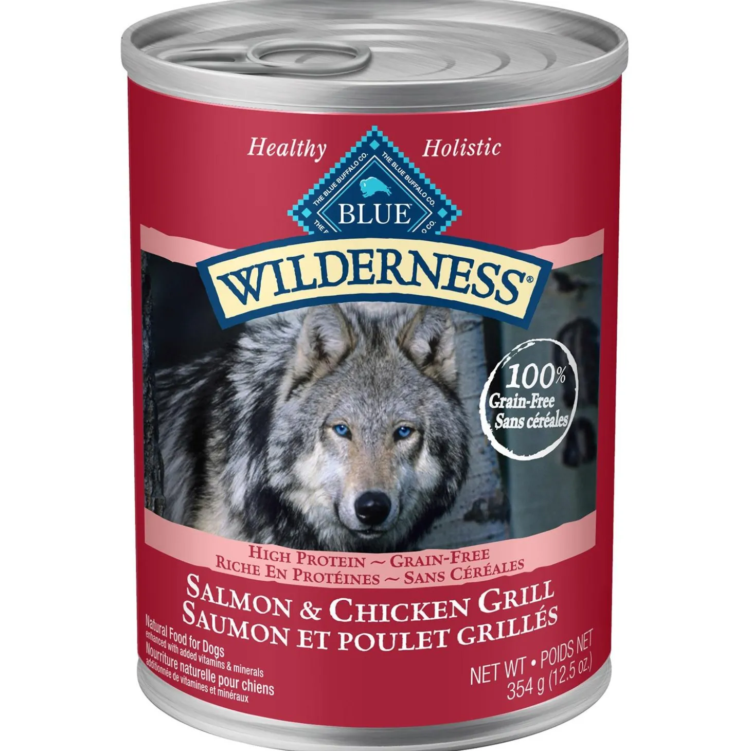 BLUE Wilderness Salmon and Chicken Grill Recipe Adult Dog Food is packed with more of the meat dogs love and free of the grains that contain gluten. With real salmon and chicken, plus fruits and vegetables, this grain free recipe features the finest natural ingredients enhanced with vitamins and minerals. Formulated for the health and well-being of your best friend, this wet food provides your adult dog with protein from real salmon and chicken to help supply the energy it needs while promoting healthy muscle growth.