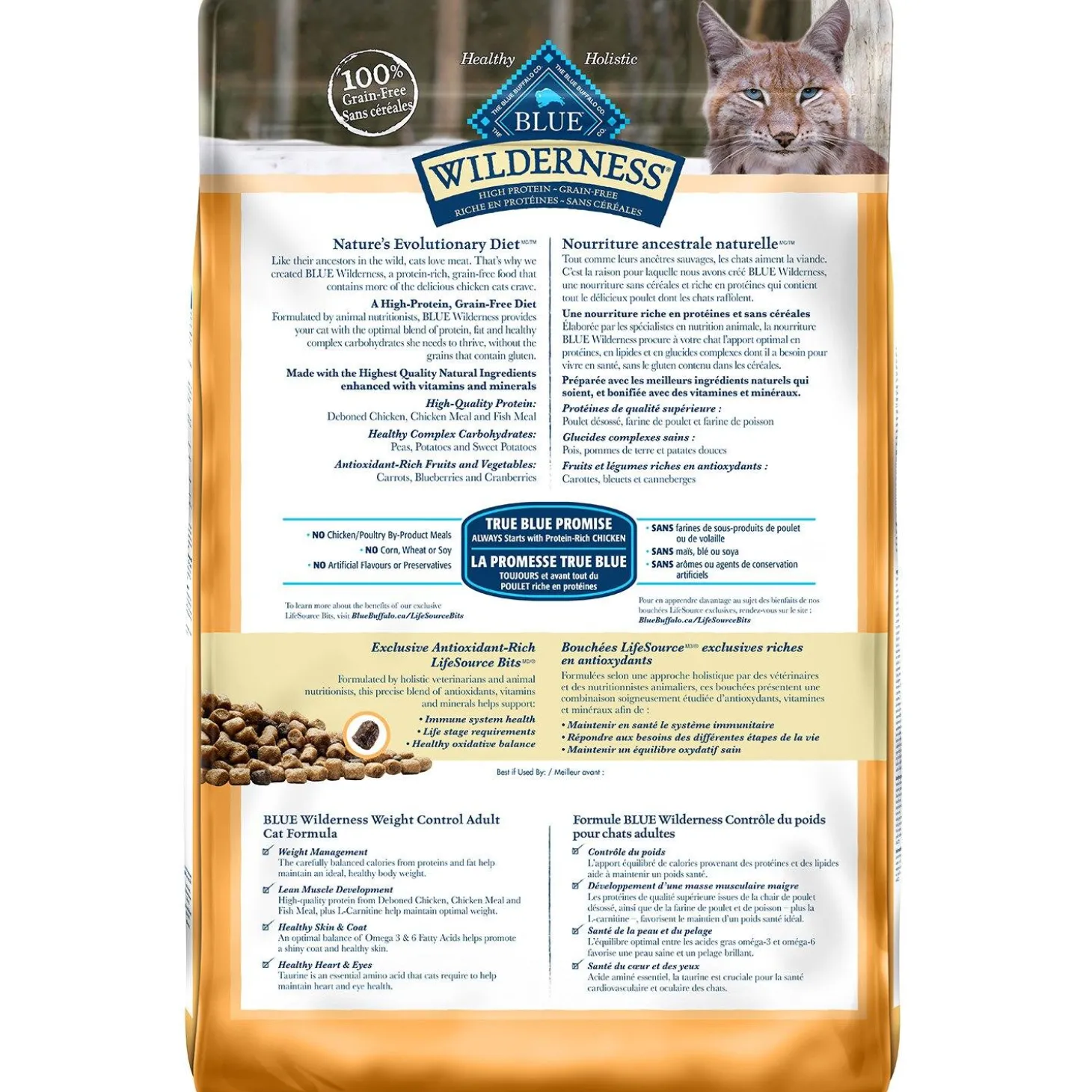 - GRAIN FREE, WEIGHT CONTROL CAT FOOD: BLUE Wilderness grain free weight control cat food is made with a careful balance of calories and fat to help your cat achieve and maintain and ideal bodyweight without any of the grains that contain gluten