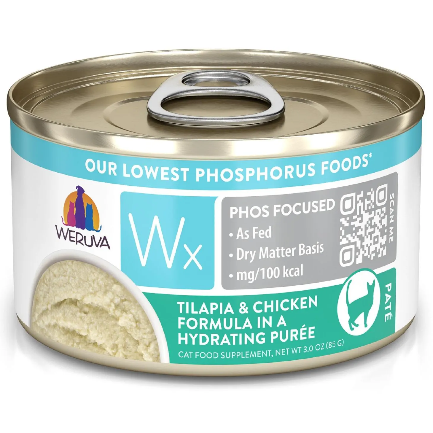 Weruva Wx Phos Focused Tilapia & Chicken Formula Pate Adult Cat Food features naturally low phosphorus proteins such as tilapia and boneless, skinless white breast meat chicken, this hydrating puree is designed for high palatability while helping to maintain muscle mass. With up to 50% less phosphorus than AAFCO’s minimum levels, Weruva Wx Phos Focused formulas are intended for intermittent or supplemental feeding, providing essential nutrition for cats in need.