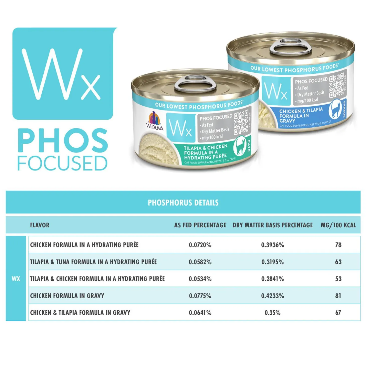 - Weruva Wx Phos Focused is for intermittent or supplemental feeding only. This product contains inadequate phosphorus levels to meet the nutritional levels established by the AAFCO Cat Food Nutrient Profiles for any life stage. Always consult your veterinarian when changing your cat’s diet