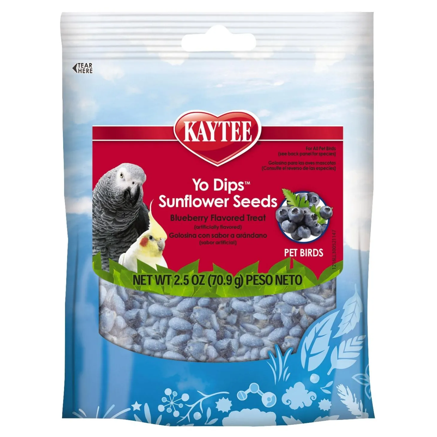 Kaytee Yo Dips Sunflower Seeds Blueberry Flavoured Treat for All Pet Birds blend extreme flavors, real fruit pieces and a creamy yogurt coating for a colourful explosion of taste and texture! These dipped treats are a wholesome, healthy way to give your pet a special treat.