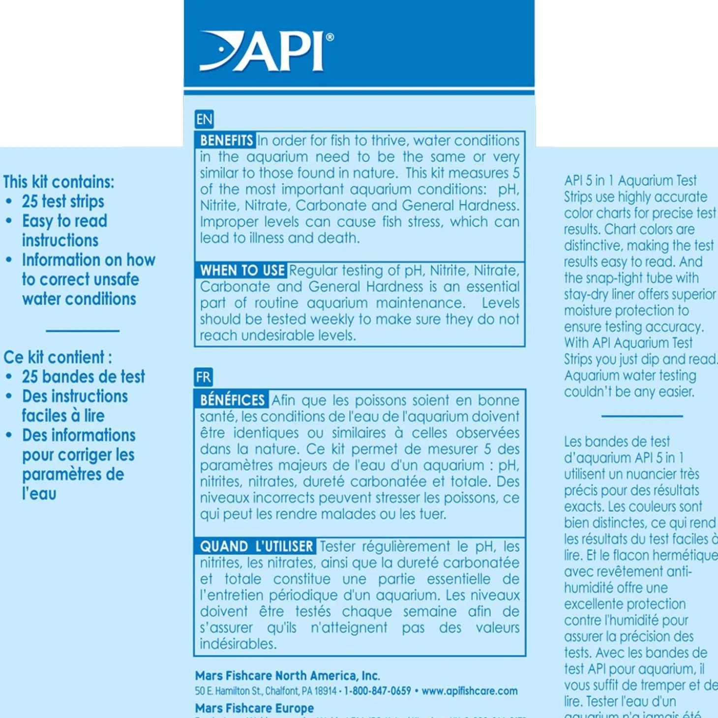 API 5 in 1 Aquarium Test Strips are easy-to-use and help to keep your fish healthy and thriving by testing your aquarium water regularly. API 5 in 1 Aquarium Test Strips are for freshwater and saltwater aquariums to help fish owners measure levels of Nitrite, Nitrate, Carbonate & General Hardness, and pH found in aquarium water. In order for fish to thrive, water must be similar to that which could be found in their natural environment. Poor water quality can cause fish stress, illness and even death.