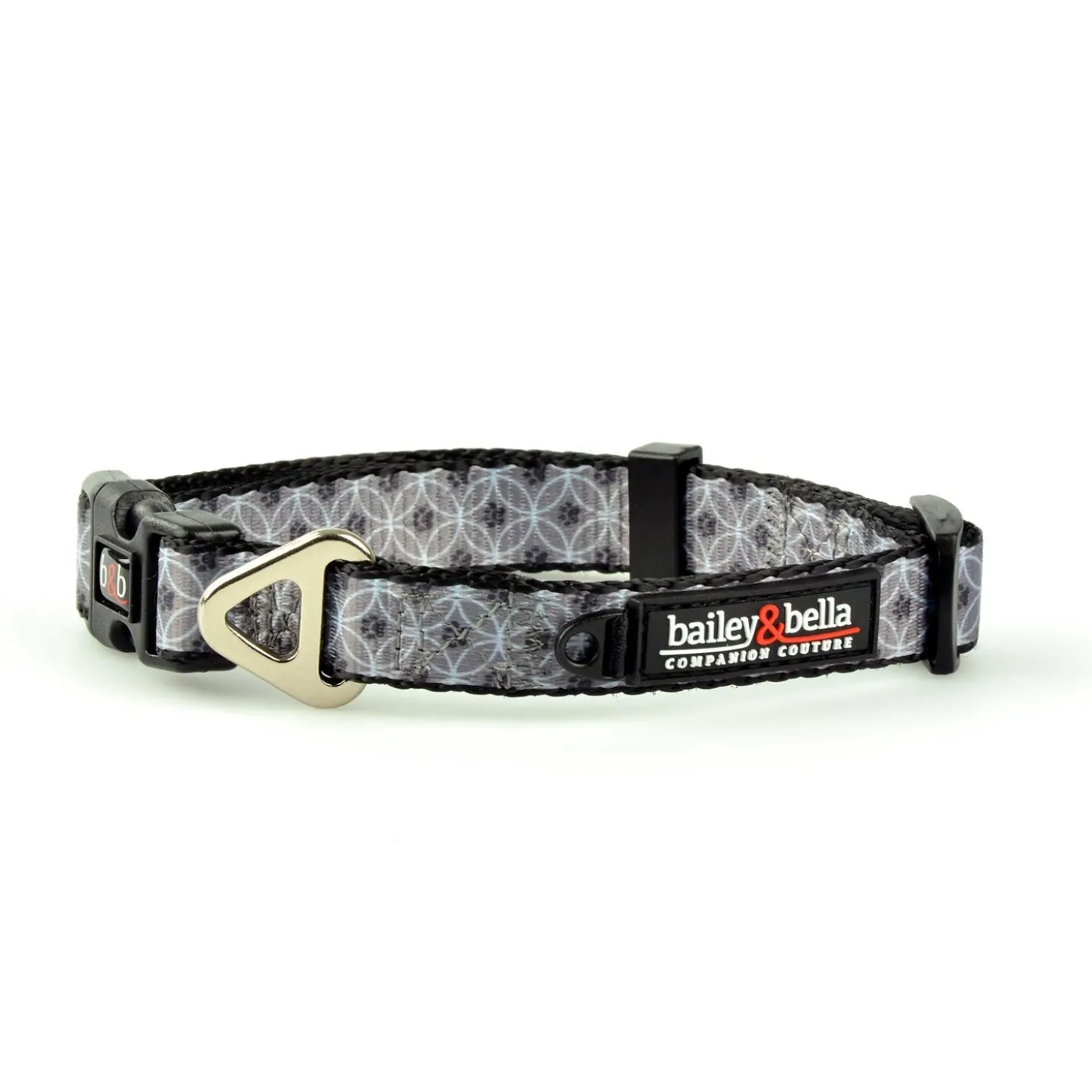 Bailey & Bella Adjustable Grey Circles Dog Collar is made with a durable plastic buckle, plastic slip locks and metal D-ring.