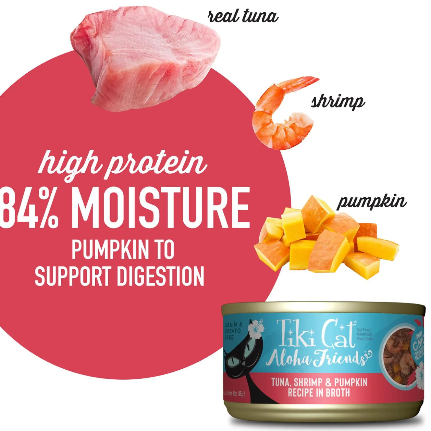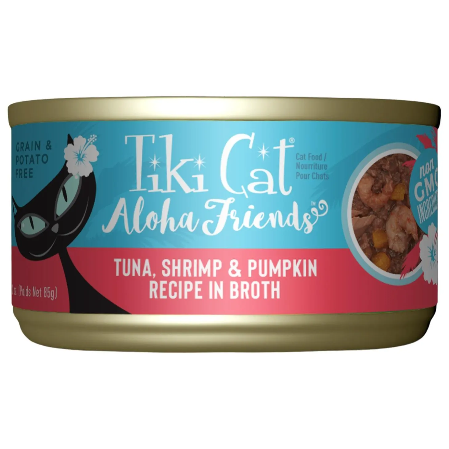 Tiki Cat Aloha Friends Tuna, Shrimp & Pumpkin Recipe in Broth Cat Food is a delicious meal with real tuna and easy-to-digest pumpkin in a delicious tuna broth.