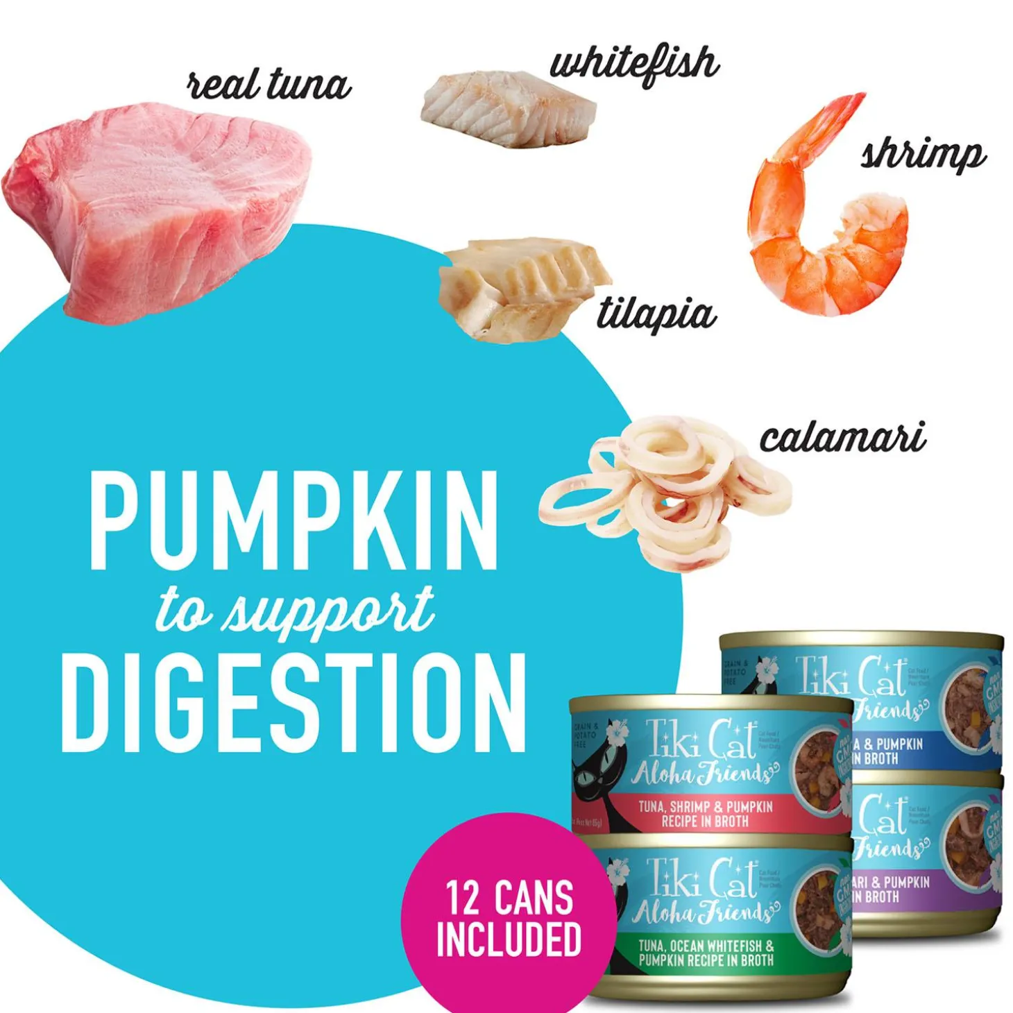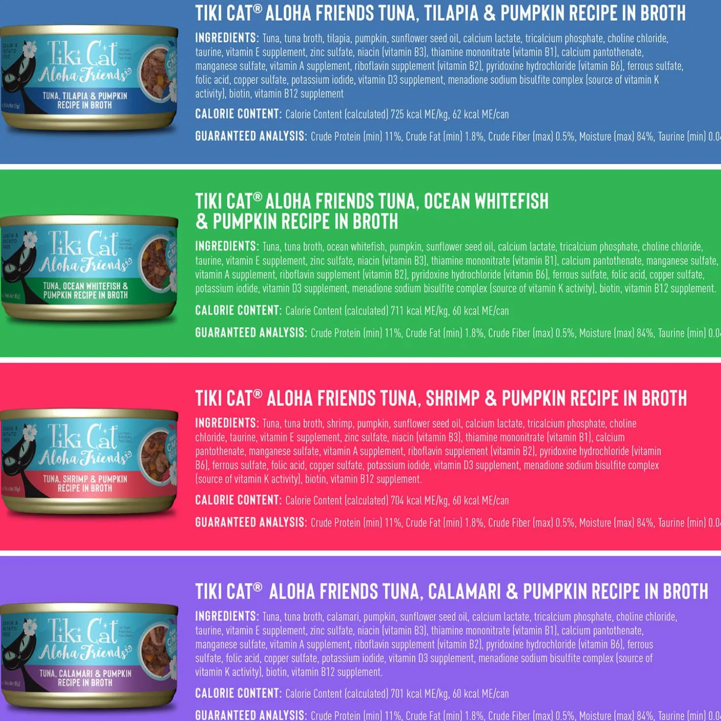 Tiki Cat Aloha Friends Variety Pack Cat Food is a delicious meal with real tuna and easy-to-digest pumpkin, combined with flavourful fish or seafood. With the Aloha Friends Variety Pack, you can feed your cat Tuna with Shrimp & Pumpkin in the morning and Tuna with Tilapia & Pumpkin at night. This keeps cats excited about mealtime, while giving them a variety of protein sources for a healthy, balanced diet.