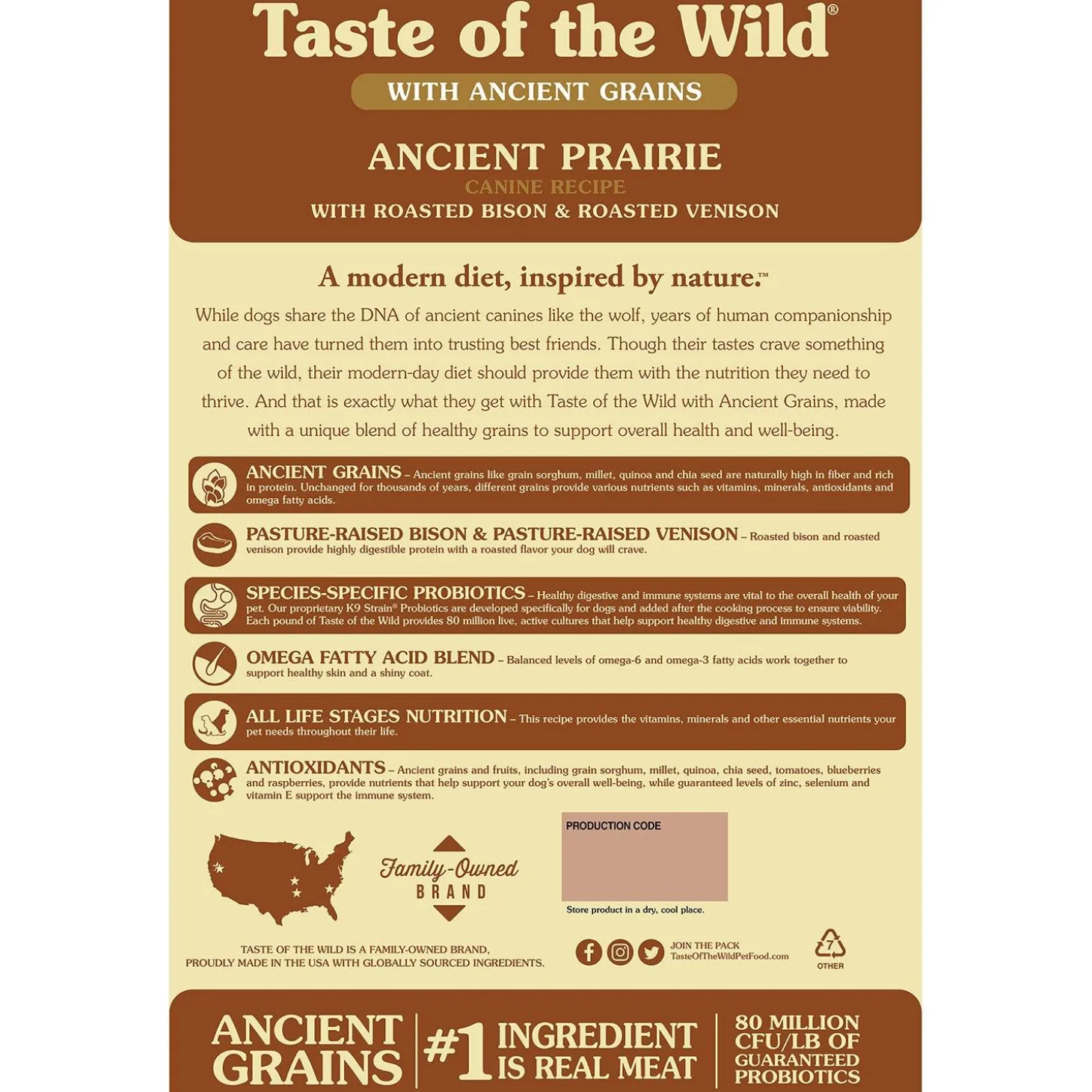 Taste of the Wild Ancient Prairie Canine Recipe with Roasted Bison & Venison is the unique combination of pasture-raised bison, pasture-raised venison and ancient grains means this is flavorful and rich in highly digestible protein. It also features antioxidants for immune support and more.
