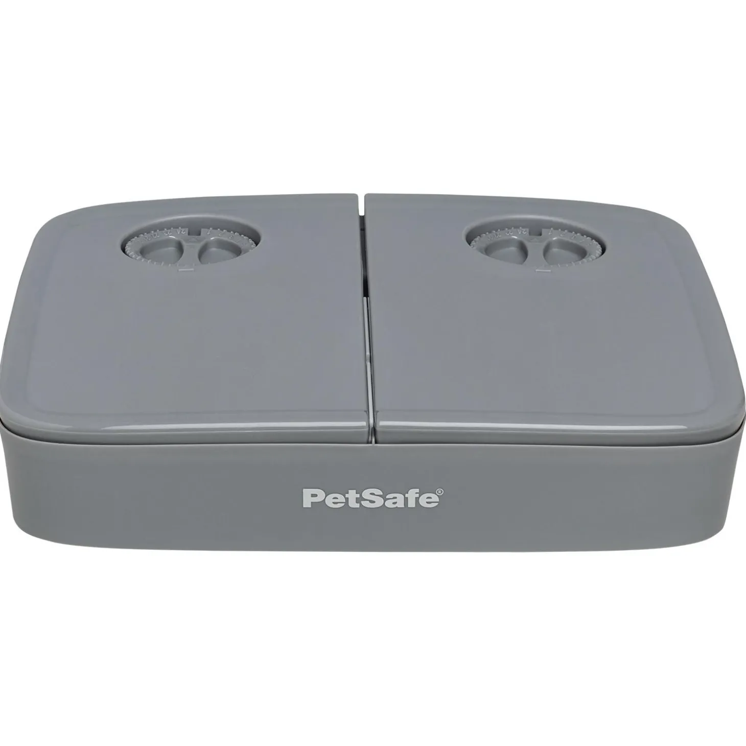 Running late? Don’t worry! We’ll help you ensure your pet will never miss a meal. The PetSafe Automatic 2 Meal Pet Feeder feeds your pet on time whether you’re at home or away. Use the dial timers to schedule your cat or dog’s meals up to 24 hours ahead of time, in half-hour increments. With scheduled mealtimes, you can control your pet’s portions to keep them happy and healthy. The removable inner tray has two compartments that each hold up to 355 ml of dry or semi-moist food. Although your pet may use their paws to try and pry the feeder open, our tamper-resistant lids make sure that even the most persistent pets can’t get to their food ahead of schedule. When you need to clean your pet’s feeder, simply remove the tray and place it in the top rack of the dishwasher.