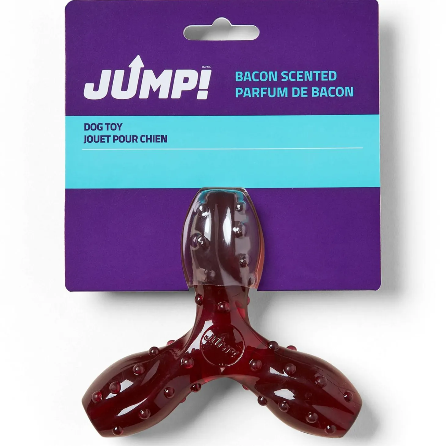 JUMP! Bacon Scented Trident Dog Toy is crafted with Scent-Fusion Technology to immerse your pup in the irresistible scent of bacon and provides a satisfying chew from durable TPR. Raised nubs gently massage your pup’s teeth, helping to control plaque and tartar build up while they chew.