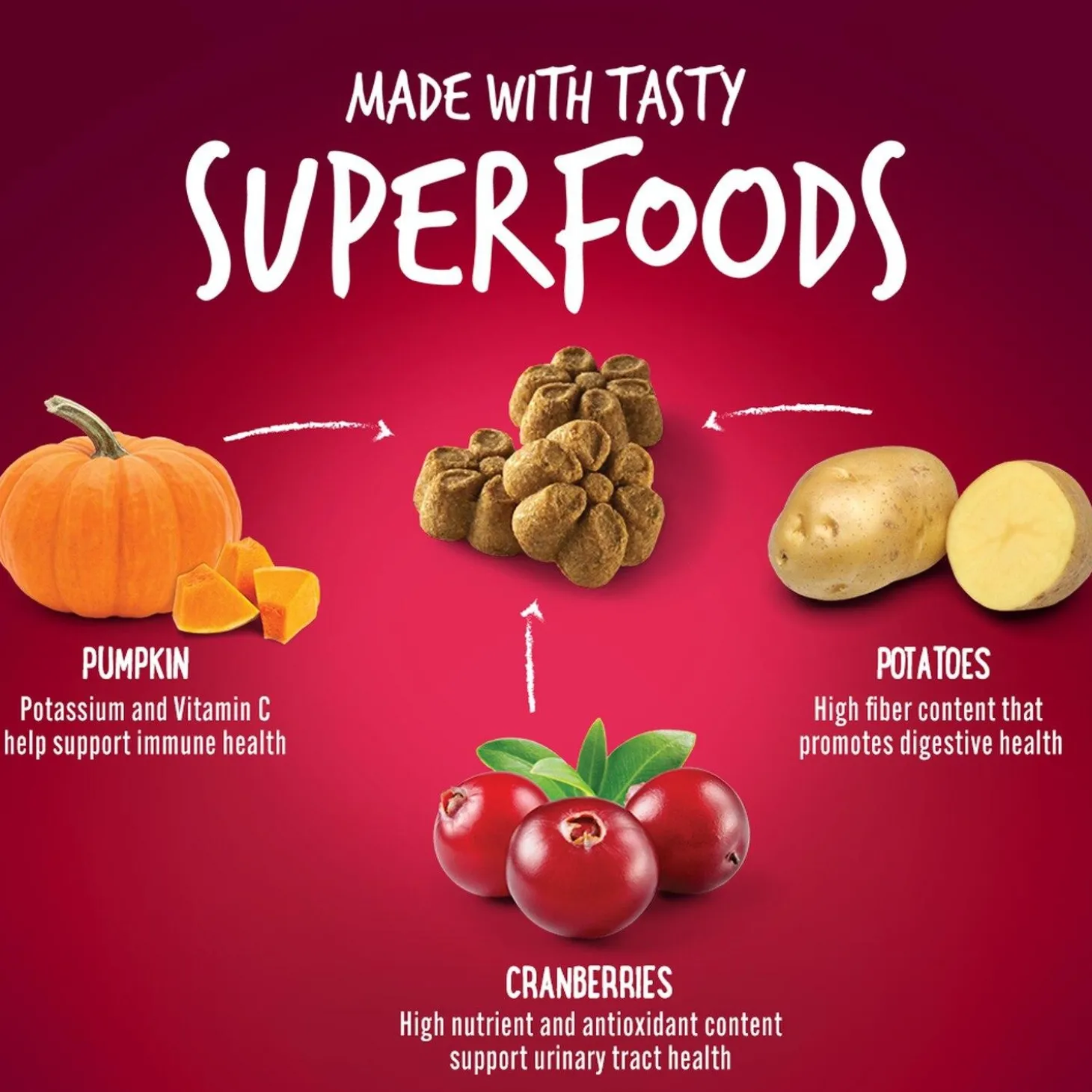 Homemade goodness! These tantalizing treats smell like muffins right out of the oven, loaded with pumpkin and cranberry and freshly baked just for your dog. Open a bag today and smell the Fruitables Baked Pumpkin & Blueberry Flavour Dog Treats difference!