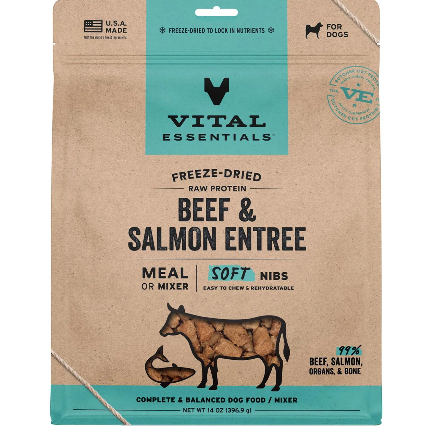 - Made with 99% beef, salmon, organs, & bone