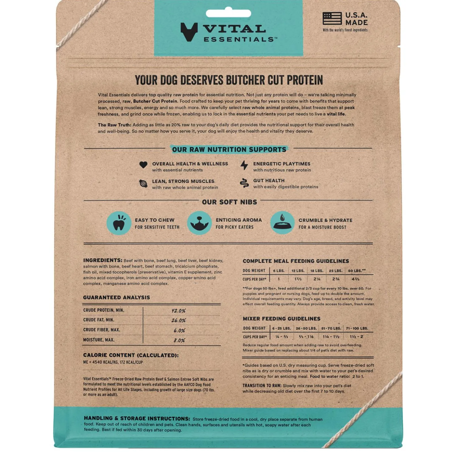 Vital Essentials Beef & Salmon Entree Soft Nibs Dog Food knows that when it comes to feeding your dog a raw diet, butcher cut protein provides superior benefits. These freeze-dried raw soft nibs are the best way to pack tons of responsibly sourced and humanely harvested whole animal protein into every bite, making feeding a raw diet at mealtimes a breeze. The naturally occurring vitamins and minerals found in butcher cut protein builds strong muscles for more play, naturally supports digestive and oral health, and provides essential nutrients for dogs to look and feel their best.