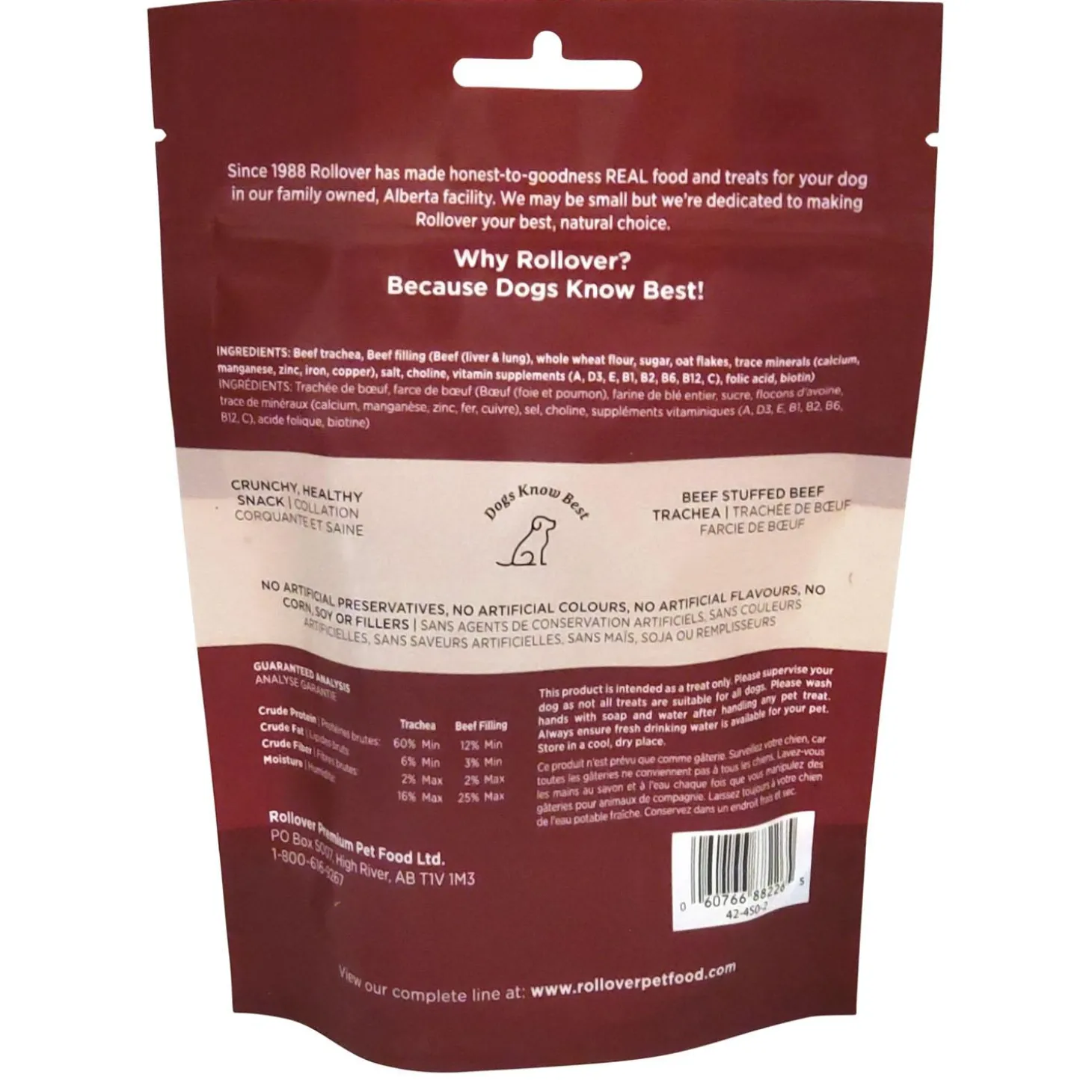 Rollover Beef Stuffed Small Chewbies Dog Treats are 100% digestible beef trachea filled with the premium Beef dog food and baked to be a delicious, crunchy treat. Trachea is an excellent natural source of glucosamine and chondroitin, making these nutritious snacks ones that can benefit your dog’s joint health.