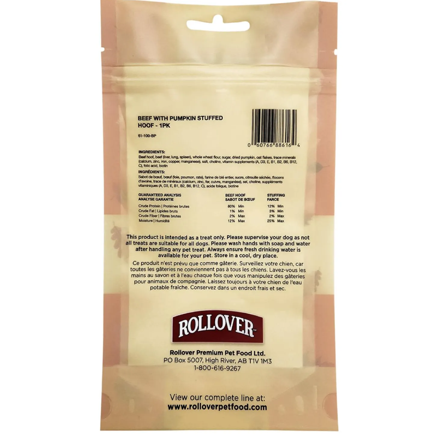 Rollover Beef with Pumpkin Stuffed Hoof Dog Treat is a natural, cleaned beef hoof filled with Rollover’s delicious seasonal Beef with Pumpkin filling and carefully baked for a dog’s chewing enjoyment. Rollover hooves are a good way to satisfy the natural urge to chew, while helping to clean teeth, and dogs love the smell and taste! This tasty filling has the added benefits of pumpkin (a proven aid to digestion; can help to ease an upset stomach; rich in nutrients and can help to boost the immune system).