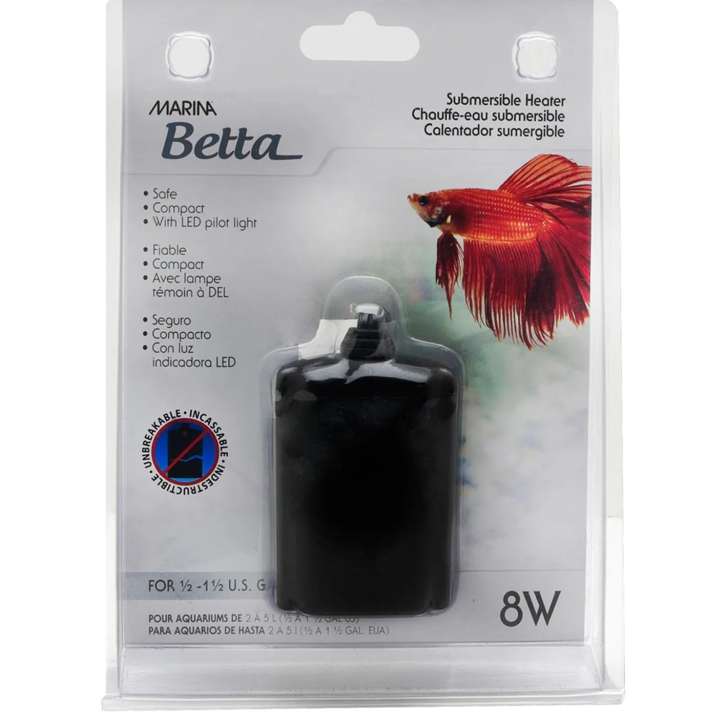 Marina Betta Heater is an automatic, submersible heater that creates ideal water conditions for bettas to thrive in. The exterior is made of durable polymer, which is more resilient than traditional glass sleeve heaters. The heater is designed to reach and maintain a set temperature – no manual adjustments required. It comes with a suction cup, so you can easily install it against the aquarium window.