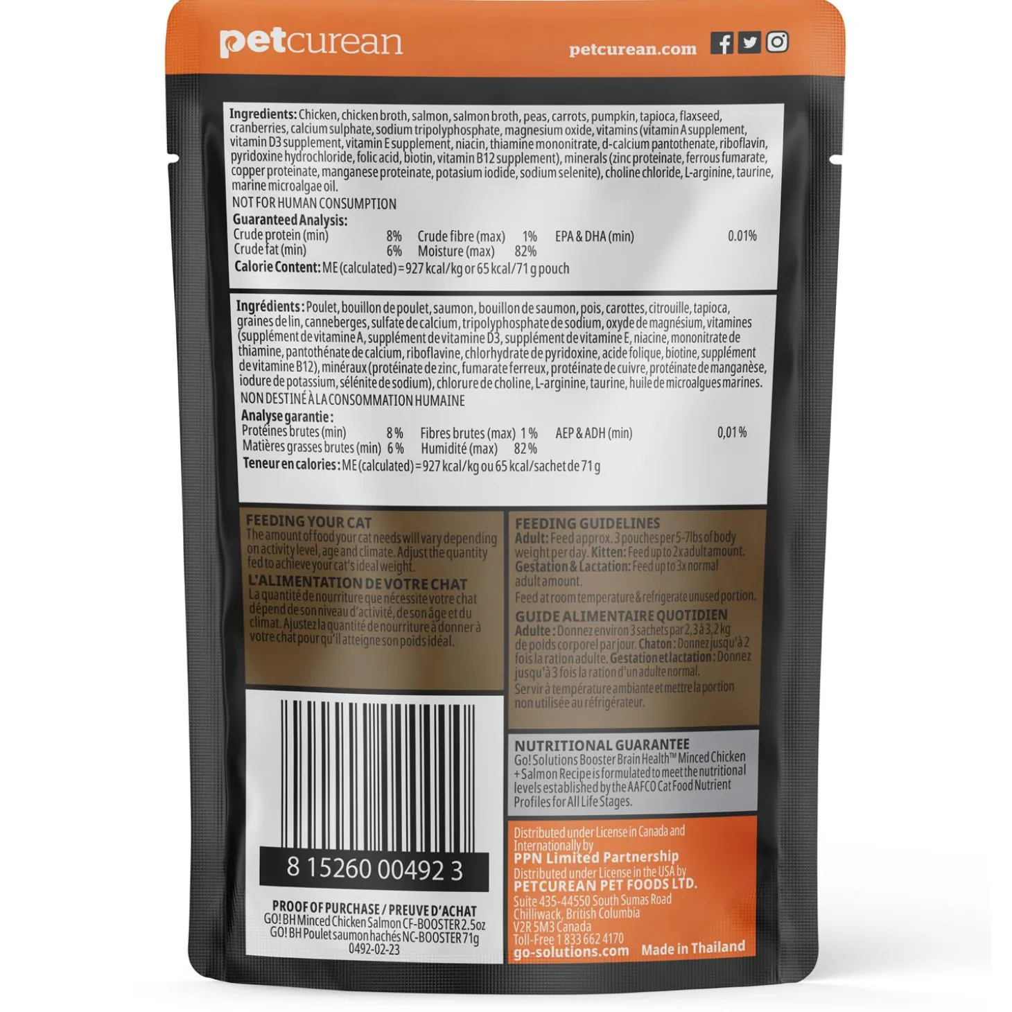 Go! Solutions Booster Brain Health Minced Chicken + Salmon Recipe With Gravy Cat Food Topper is a great way to help maintain your very-clever-cat’s cognitive capabilities with this complete and balanced cat food topper designed to support your cat’s healthy brain. Go! Solutions Booster Brain Health Minced Chicken + Salmon Recipe Cat Food for brain health combines DHA and EPA-rich salmon and marine microalgae oil with vitamin- and mineral-rich fruits and veggies to help maintain a healthy brain and sharp mind. It’s a functional, flavourful wet food your ‘smarty cat’ will love.