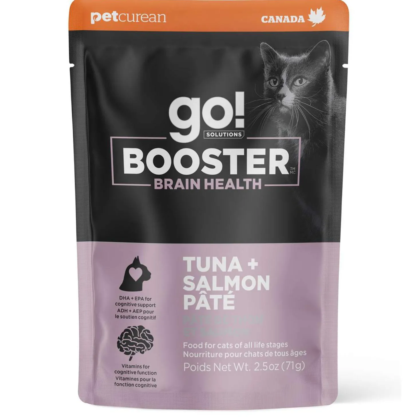 Go! Solutions Booster Brain Health Tuna + Salmon Pate Cat Food Topper combines DHA and EPA-rich salmon, tuna, and marine microalgae oil with vitamin- and mineral-rich fruits and veggies to help maintain a healthy brain and sharp mind. Help maintain your very-clever-cat’s cognitive capabilities with a complete + balanced cat food topper designed to support your cat’s healthy brain. It’s a functional, flavourful wet food your ‘smarty cat’ will love.