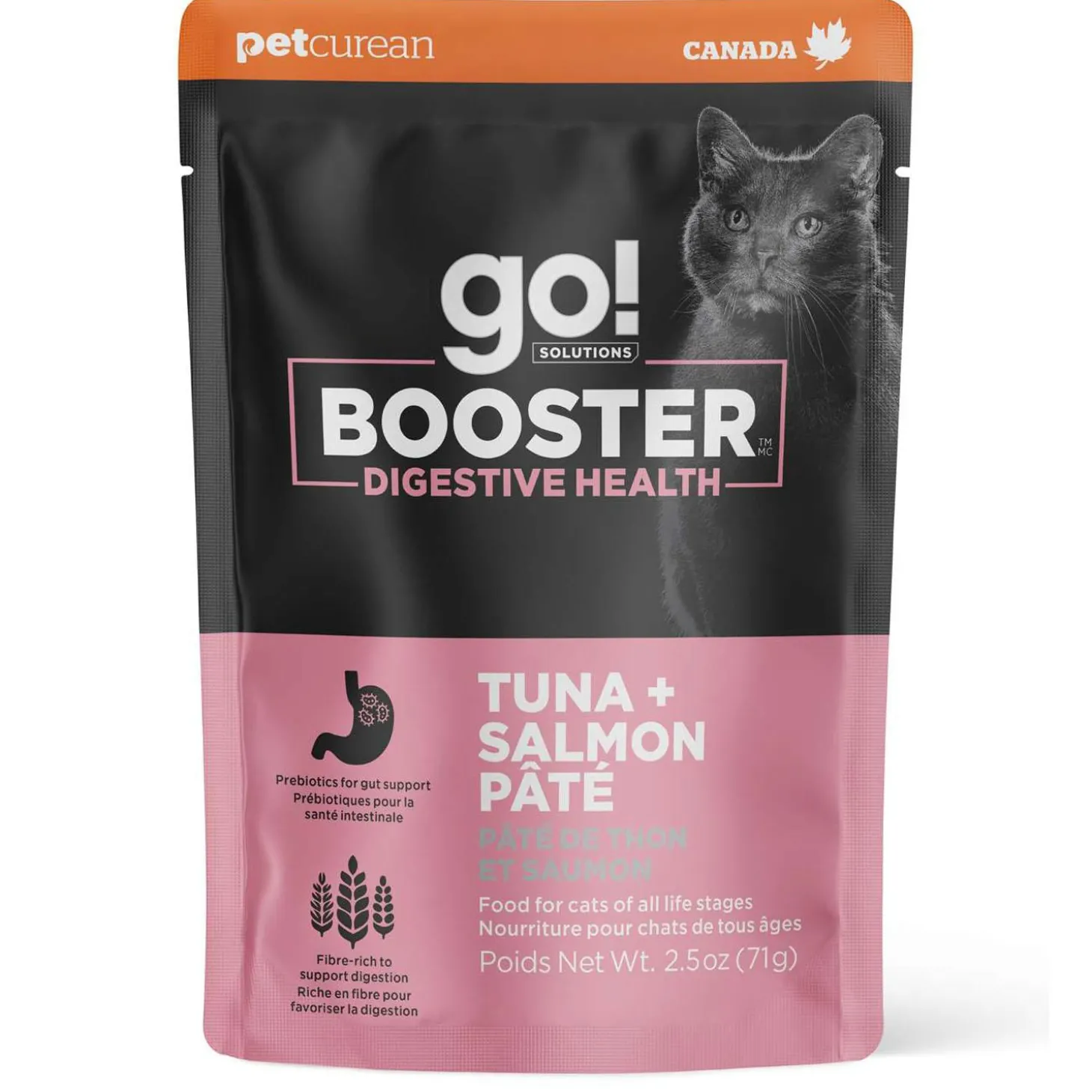 Go! Solutions Booster Digestive Health Tuna + Salmon Pate Cat Food Topper is rich in prebiotics and fibre to support gut health and good digestion. Maintaining your cat’s healthy digestion is key to a long, happy life (or nine). This food is packed with tasty lean proteins and flavourful fibre-providing ingredients including pumpkin, flaxseed, chicory root and psyllium husk. This recipe is purpose-made to satisfy cravings while maintaining digestive health.