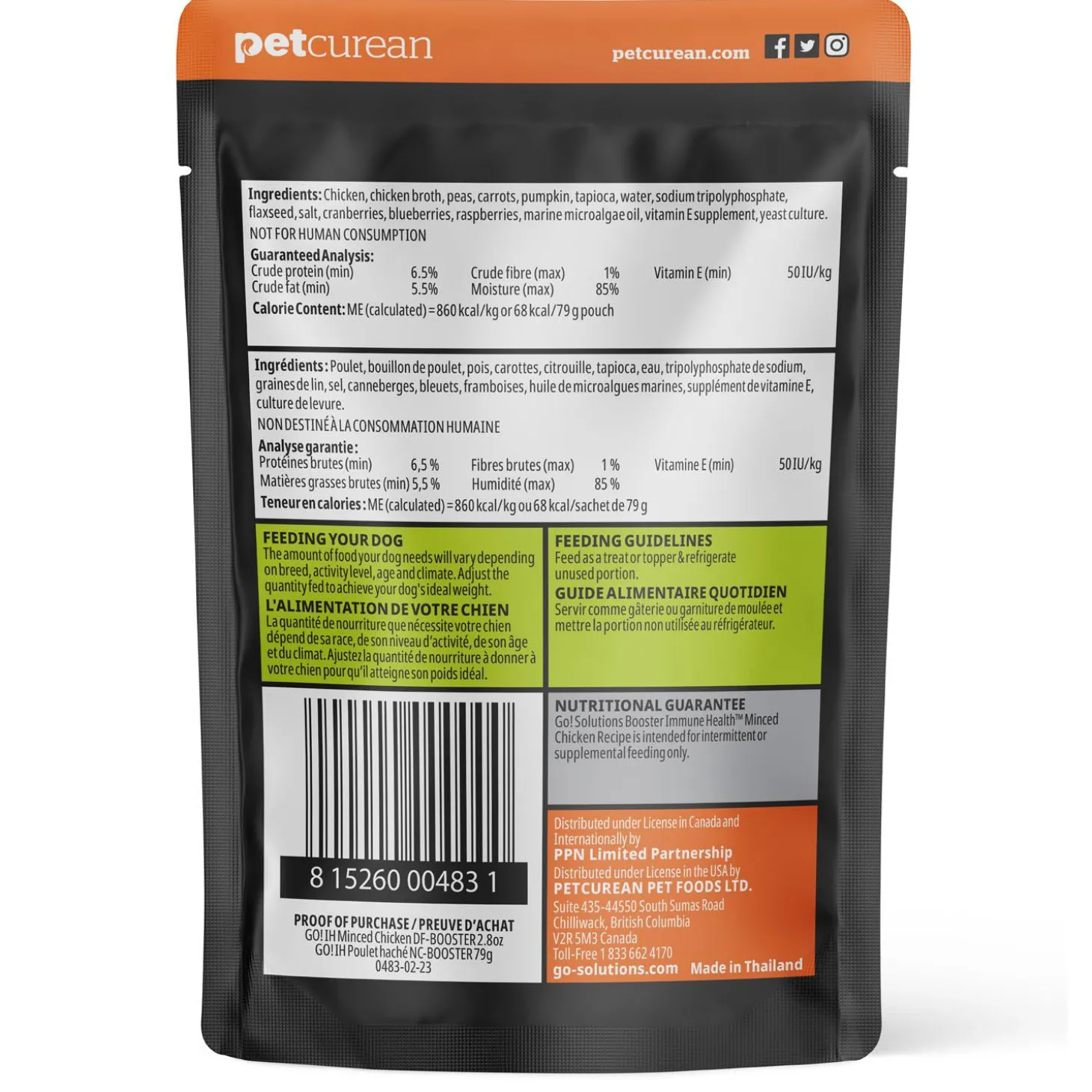 Go! Solutions Booster Immune Health Minced Chicken Recipe With Gravy Dog Food Topper will add variety + immune support to your best friend’s bowl. Loaded with postbiotics + antioxidants from Vitamin E and fruits including cranberries, blueberries, and raspberries to support a healthy immune system, our Immune Health dog food topper is a great (and oh-so tasty) way to help maintain everyday immunity.