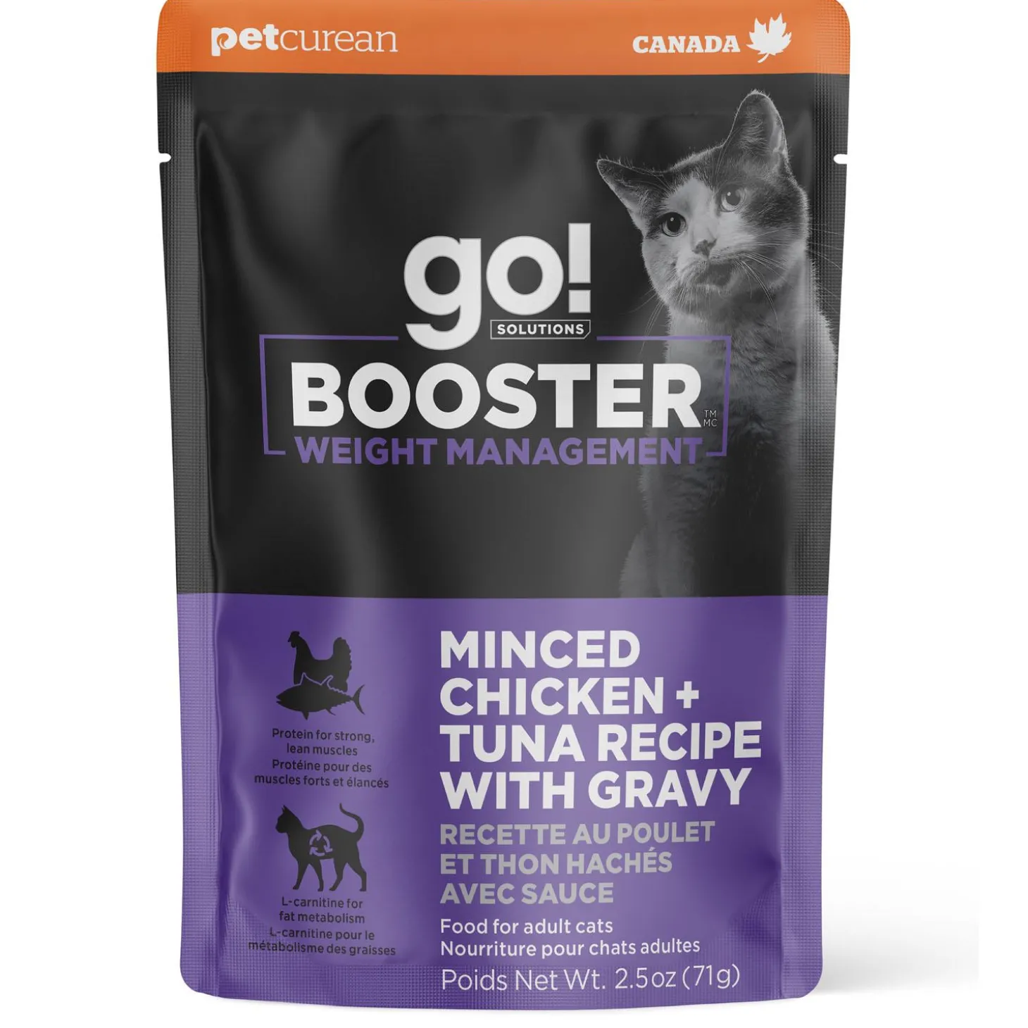 Go! Solutions Booster Weight Management Minced Chicken + Tuna Recipe With Gravy Adult Cat Food Topper is a great way to help manage your mature cat’s weight which doesn’t involve foregoing flavour and nutrition. Go! Solutions Booster Weight Management Minced Chicken + Tuna Recipe Adult Cat Food Topper combines lean proteins with fibre-rich psyllium husk and veggies to keep your cat feeling full. With L-carnitine to support healthy metabolism and help burn cat fat into active energy, this complete and balanced weight control recipe makes for a functional stand-alone meal or a tasty topper.