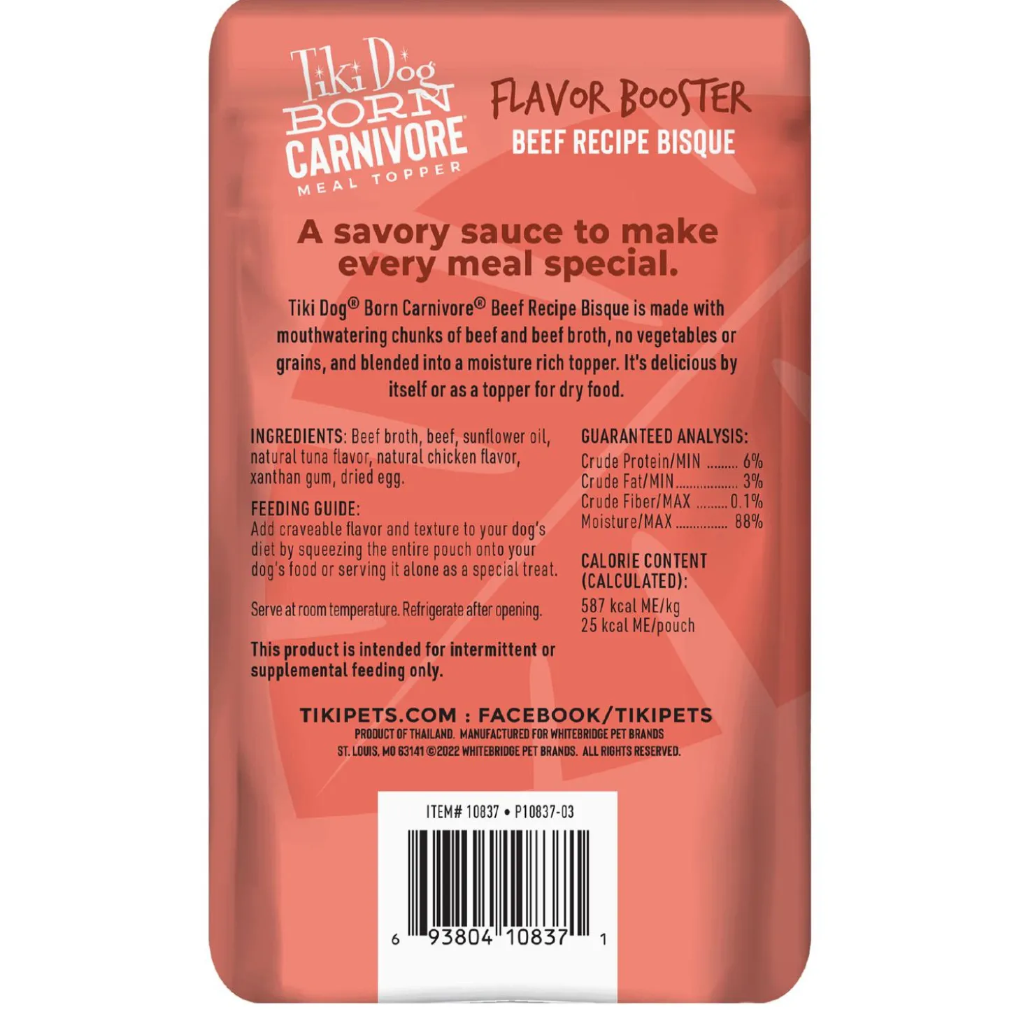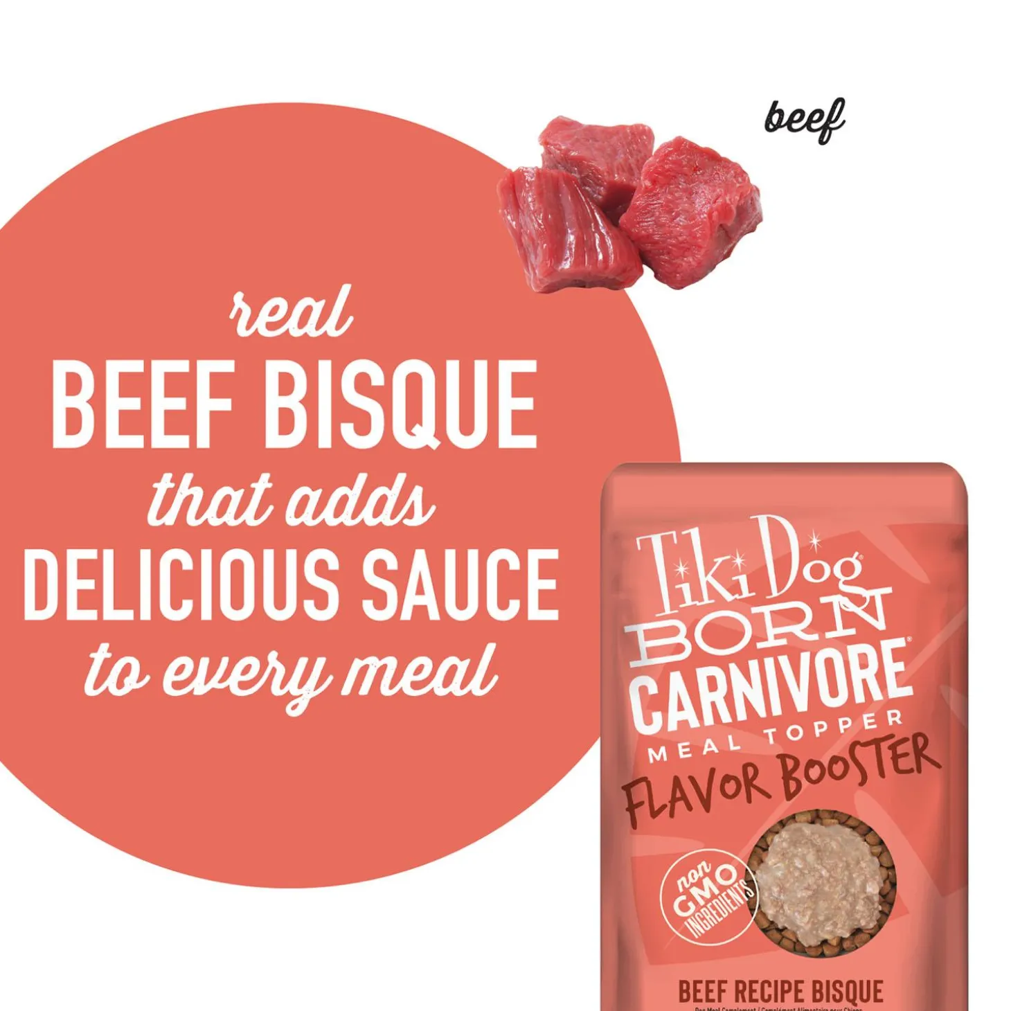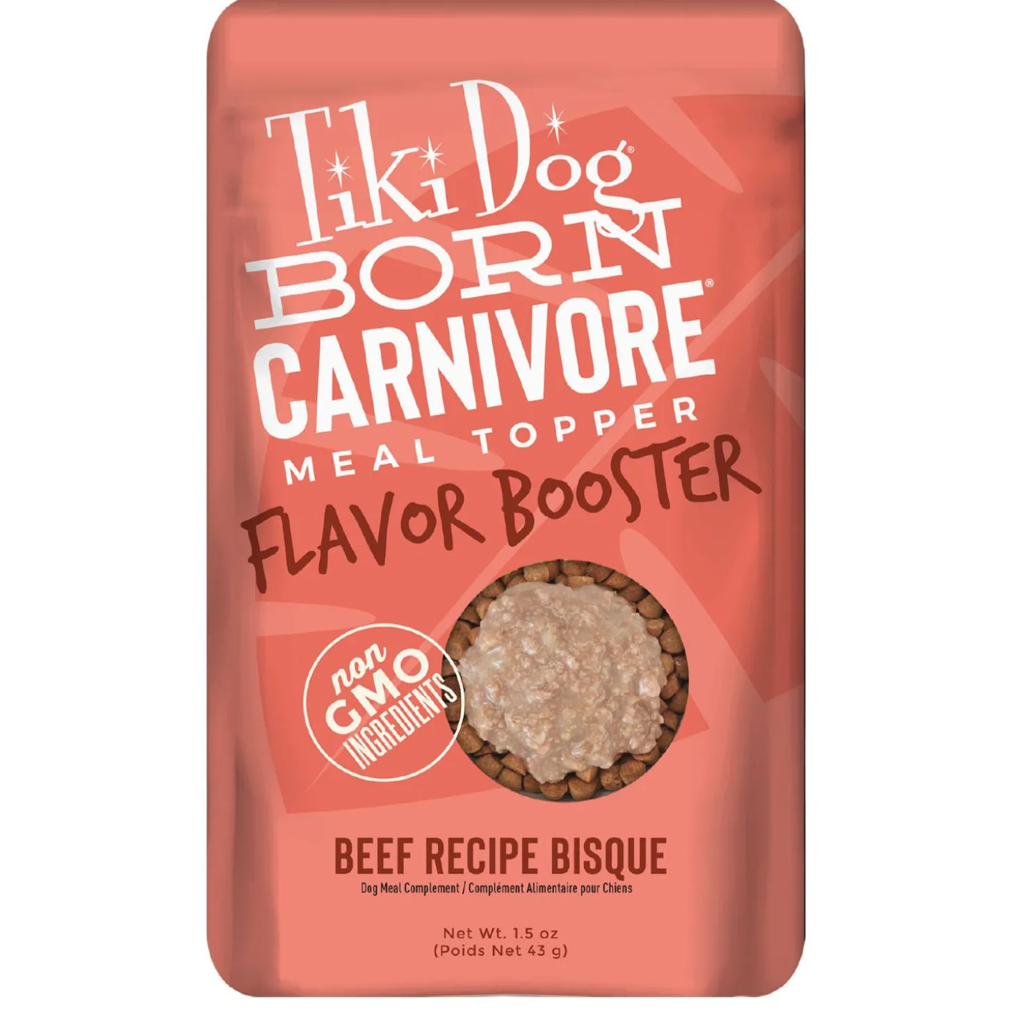 - Tiki Dog Born Carnivore Flavour Boosters offers a decadent gravy with small chunks of protein for a luxurious meal topper or treat for supplemental nutrition for your dog