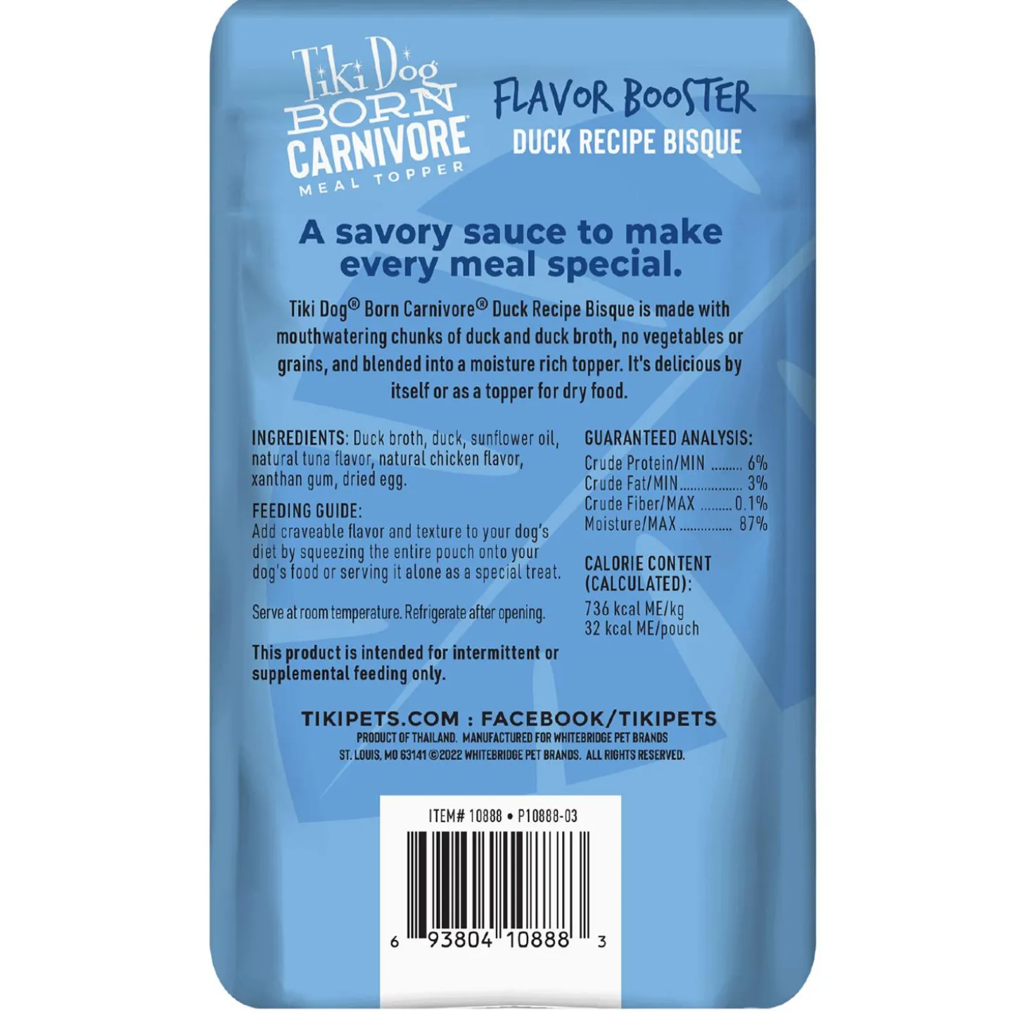Tiki Dog Born Carnivore Flavour Booster Duck Recipe Bisque Dog Food Topper is for dogs who like things saucy. Squeeze this savory, meaty bisque on top of dry food to boost flavour and add moisture. This is the perfect addition to create the most satisfying, mixed carnivore meal and crunchy, bite-sized kibble that is topped with a meaty, hydrating sauce. Tiki Dog offers drool-worthy taste in the nutrition that dogs need! Designed with the highest standards in nutrition to keep dogs in optimal health, and you can see it in every bowl.