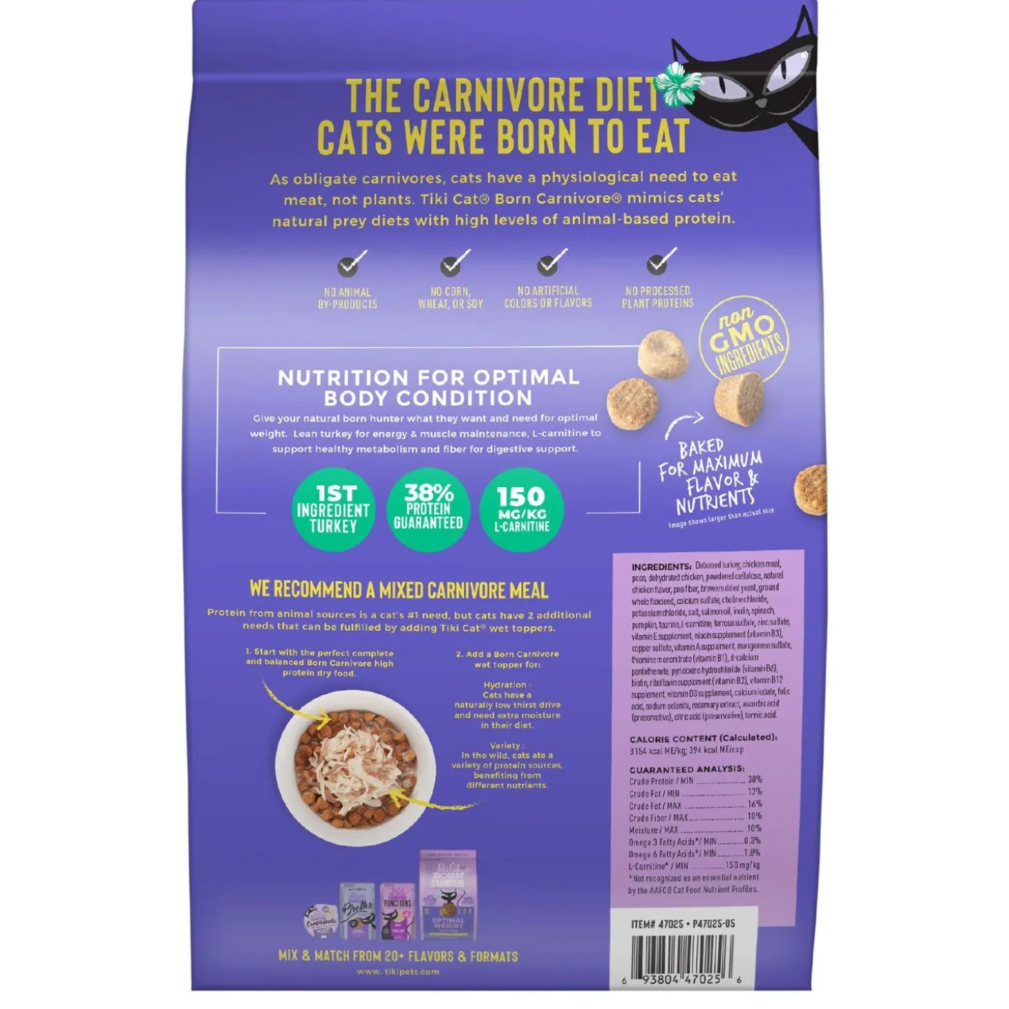 Tiki Cat Born Carnivore Optimal Weight Turkey Recipe Adult Cat Food is oven-baked, minimally processed and protein-rich, with real turkey and chicken in a low-calorie formula to support a healthy weight. Potato and grain-free, plus omega fatty acid sources for beautiful skin and coat. No animal by-products, corn, wheat or soy, and no artificial flavours or colours.