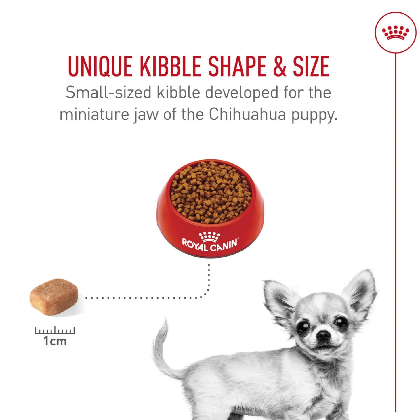 - This exclusive small-sized kibble has been developed to be adapted to the miniature jaw of the Chihuahua puppy.