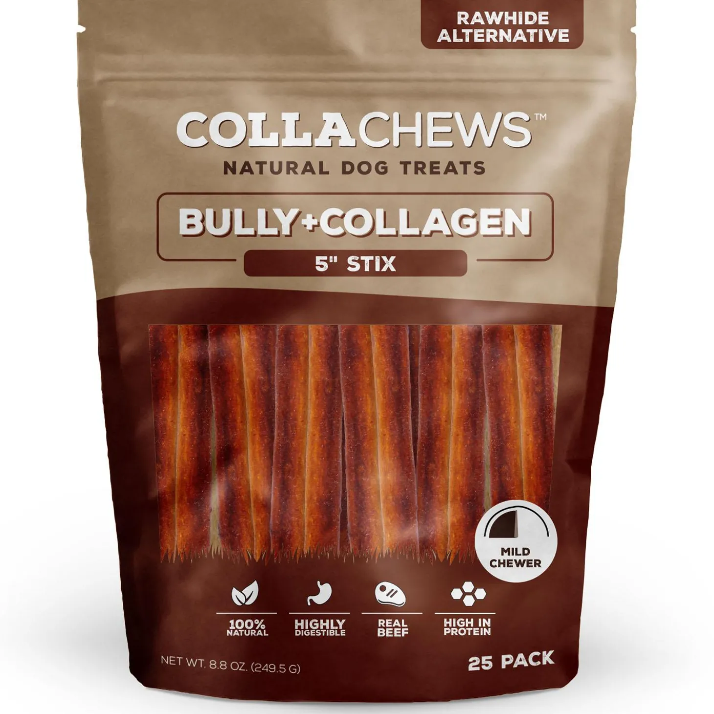 CollaChews Bully Collagen 5in Sticks Dog Treats are all-natural rawhide alternatives made of Collagen from grass-fed beef and real chicken, and beef. Scientifically tested for digestibility, these chews are meticulously hand crafted to assure your pup gets a healthy, safe, and tasty treat.