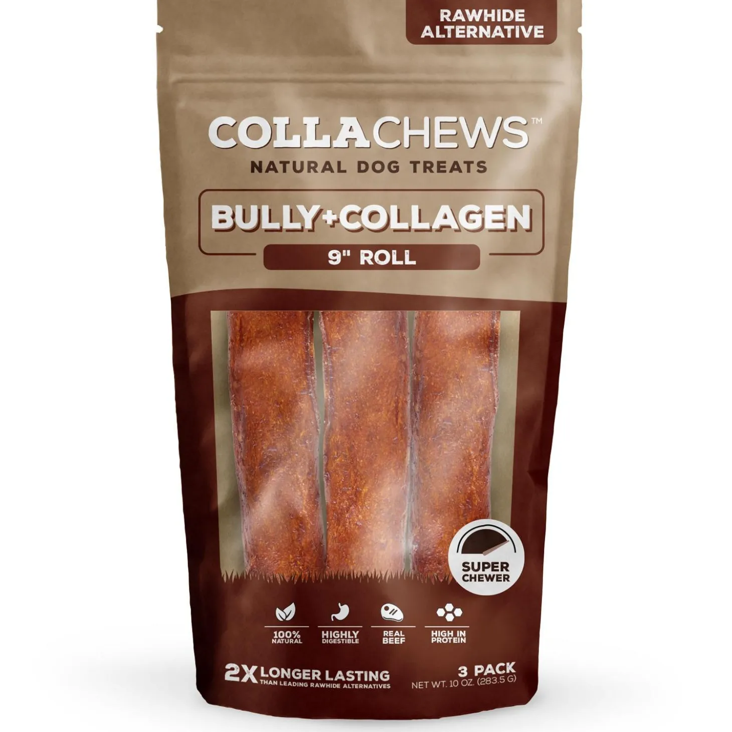 CollaChews Bully Collagen 9in Rolls Dog Treat are all-natural rawhide alternatives made of Collagen from grass-fed beef and real chicken, and beef. Scientifically tested for digestibility, these chews are meticulously hand crafted to assure your pup gets a healthy, safe, and tasty treat.